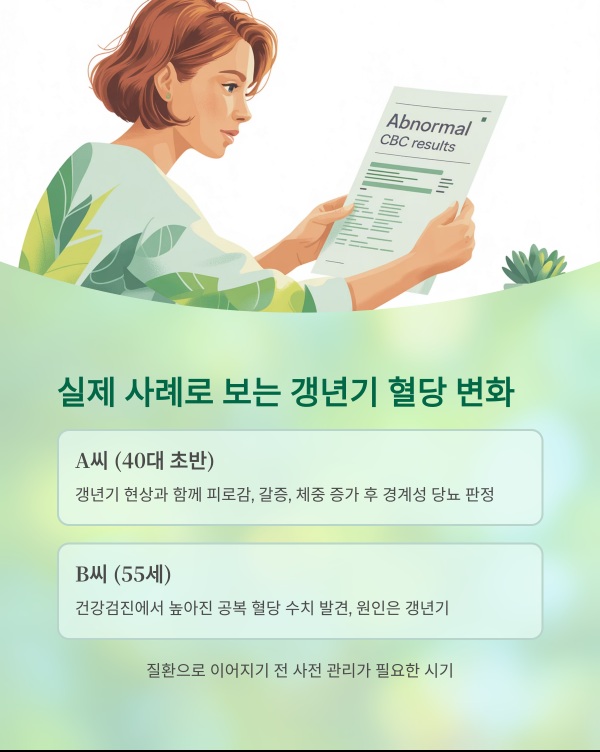 40대 초반 여성 A 씨는 갱년기 현상과 함께 계속되는 피로감, 잦은 갈증, 체중 증가를 겪었고 검진 결과 경계성 당뇨 판정을 받았어요. B 씨(55세)는 건강검진에서 예전보다 높아진 공복 혈당 수치를 보고 놀랐는데, 알고 보니 그 원인이 갱년기였던 거죠. 이렇게 질환으로 이어지기 전에 사전 관리가 필요한 시기가 바로 갱년기입니다.