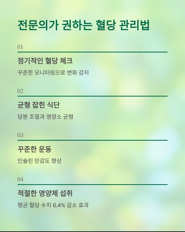 전문의들은 갱년기 여성의 혈당 관리를 위해 정기적인 혈당 체크, 균형 잡힌 식단, 꾸준한 운동 외에도 적절한 영양제 섭취가 도움이 된다고 밝혔어요. 건강기능식품협회 자료에 따르면 혈당 관련 영양제를 복용한 갱년기 여성이 복용 전 대비 평균 혈당 수치가 약 6.4% 낮아졌다는 보고도 있어요. 혈당이 높아지기 전부터 미리 조치하면 당뇨를 예방하고 갱년기 현상도 완화할 수 있습니다.