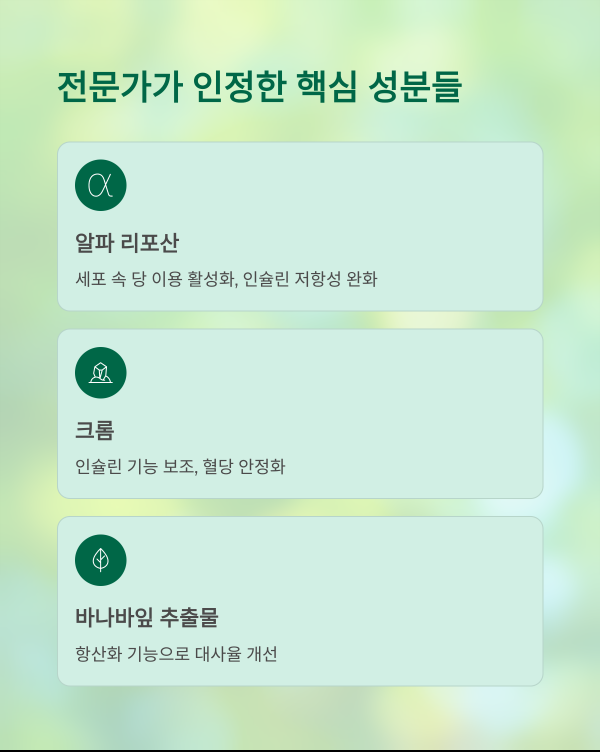 전문가들은 갱년기 여성의 혈당 조절에 도움이 되는 주요 영양 성분으로 ‘알파 리포산’, ‘크롬’, ‘바나바잎 추출물’을 가장 많이 꼽아요. 내분비내과 전문의 김지혜 박사는 “알파 리포산은 세포 속 당 이용을 활성화해 인슐린 저항성을 완화시켜주고, 크롬은 인슐린 기능을 보조해 혈당 안정에 효과적”이라고 말했어요.
