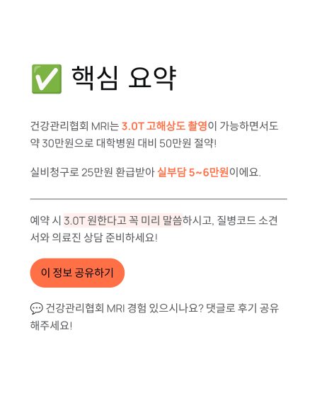 일반 검진용은 보통 1.5T(테슬라) MRI를 사용하는데요, 정밀 진단이 필요한 경우 대학병원에서는 3.0T를 요구해요. 해상도가 2배나 높아서 더 정확한 진단이 가능하답니다. 건강관리협회는 3.0T 장비를 보유하고 있어서 대학병원급 검사가 가능해요!