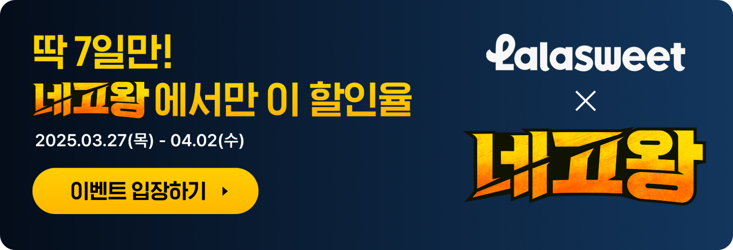 라라스윗은 2025년 3월 27일부터 4월 2일까지 네고왕과의 협업으로 대규모 할인 이벤트를 진행 중입니다. 이 행사는 단 7일간 진행되며, 공식 홈페이지(lalasweet.kr)에서만 적용됩니다. 할인 폭이 상당히 커 소비자들 사이에서 화제가 되고 있습니다.