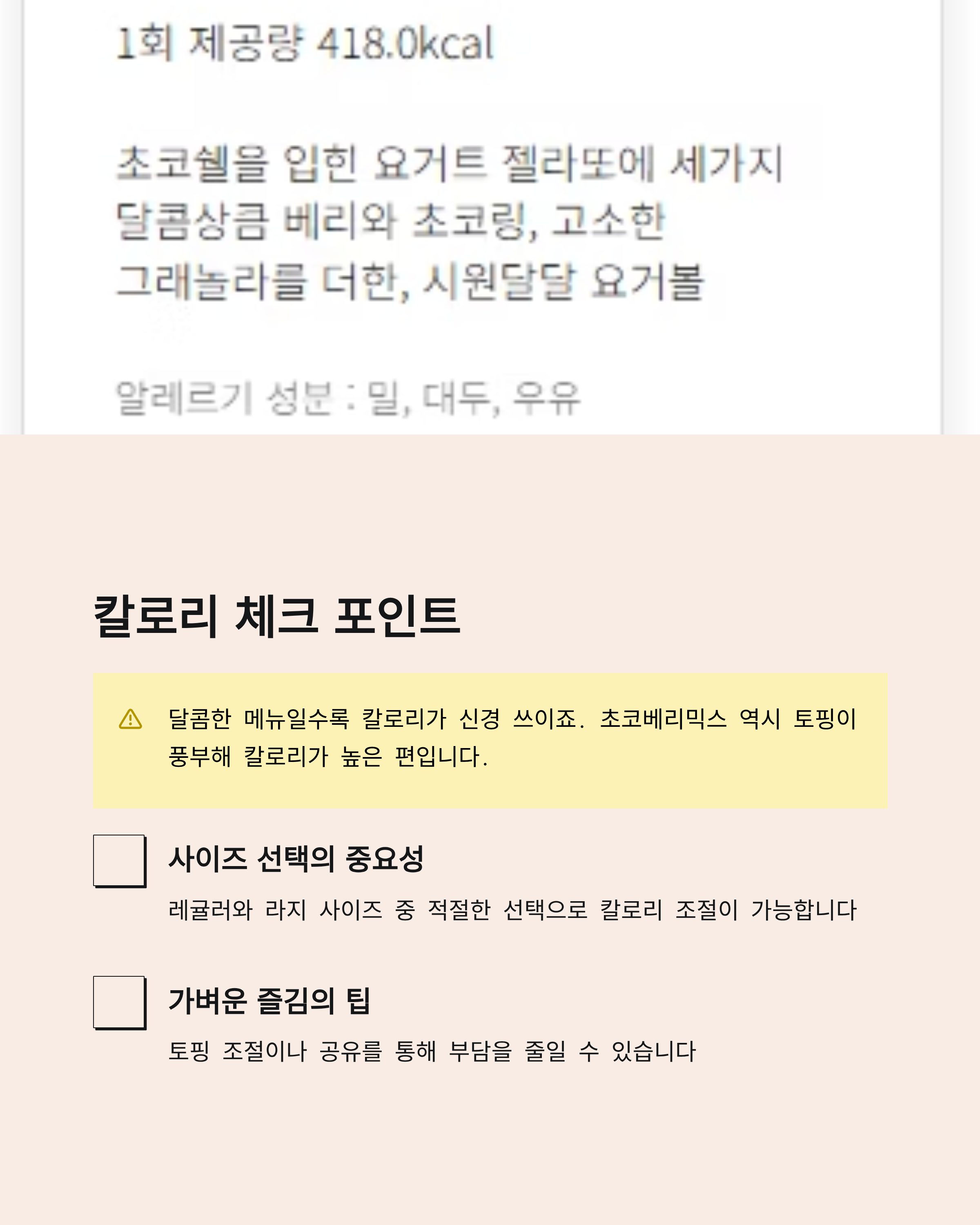 달콤한 메뉴일수록 칼로리가 신경 쓰이죠. 초코베리믹스 역시 토핑이 풍부해 칼로리가 높은 편입니다. 다만 사이즈 선택과 함께 가볍게 즐기면 부담을 줄일 수 있습니다.