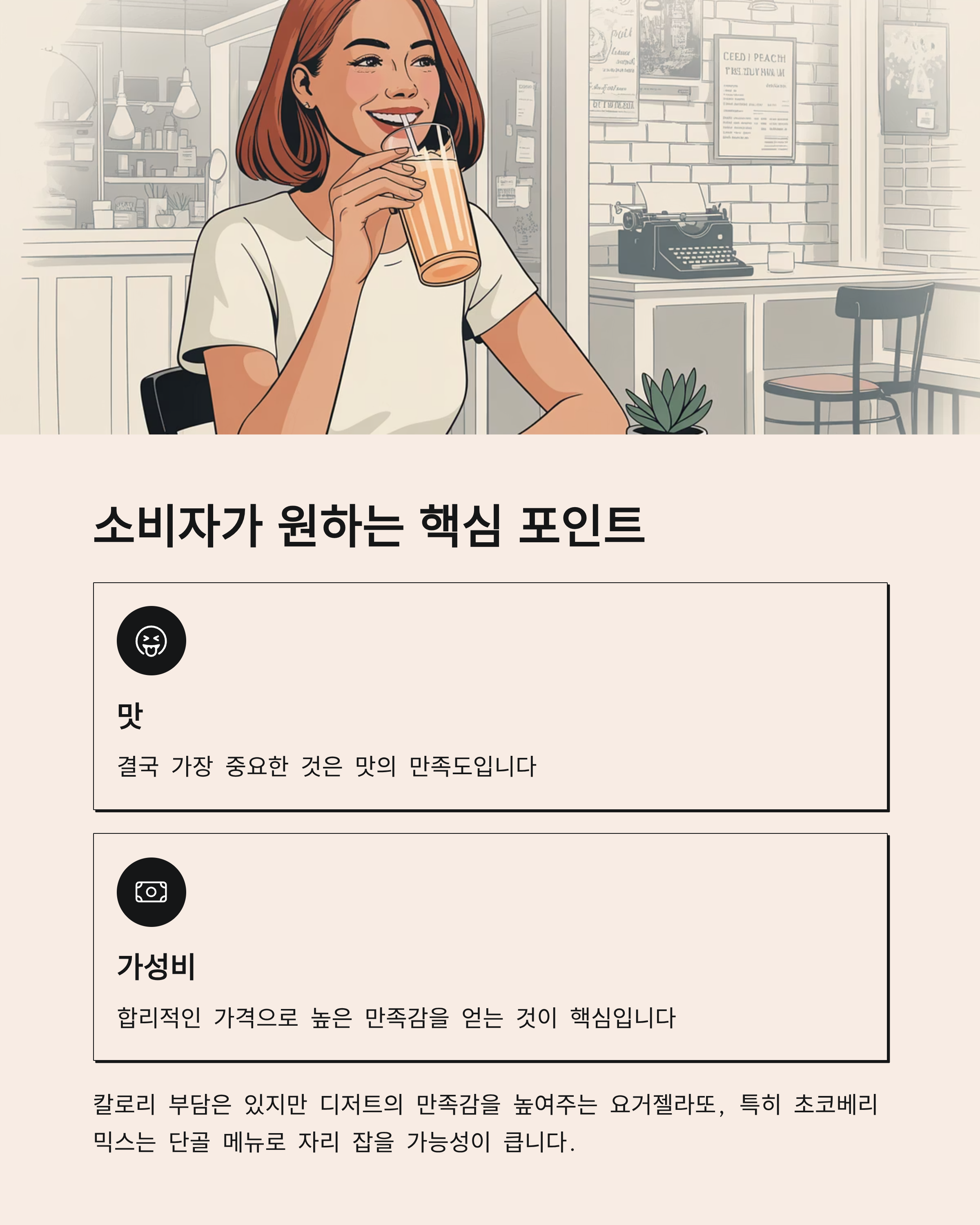 결국 중요한 건 "맛과 가성비"입니다. 칼로리 부담은 있지만 디저트의 만족감을 높여주는 요거젤라또, 특히 초코베리믹스는 단골 메뉴로 자리 잡을 가능성이 큽니다.