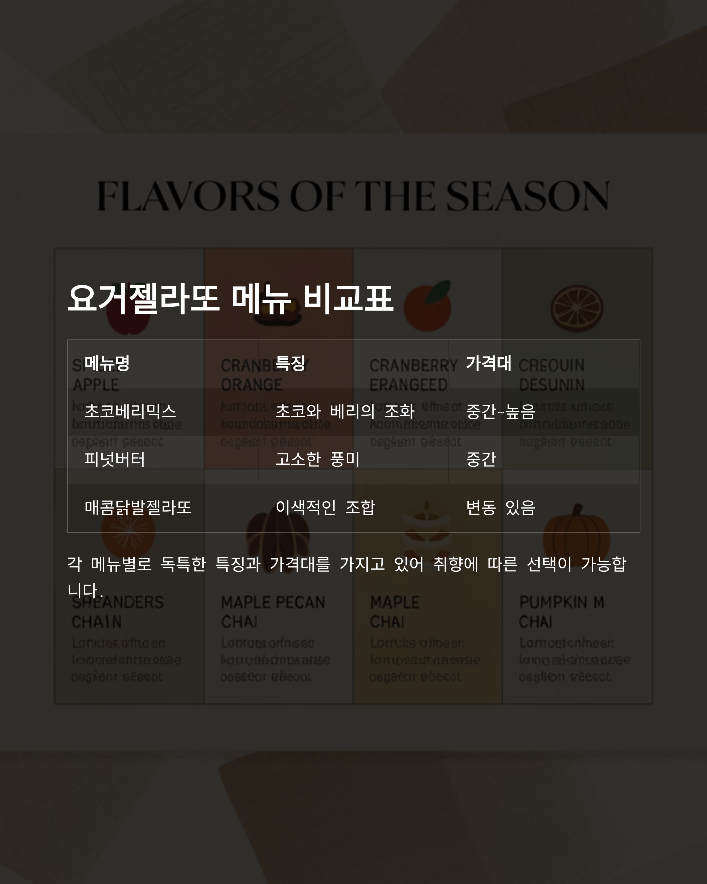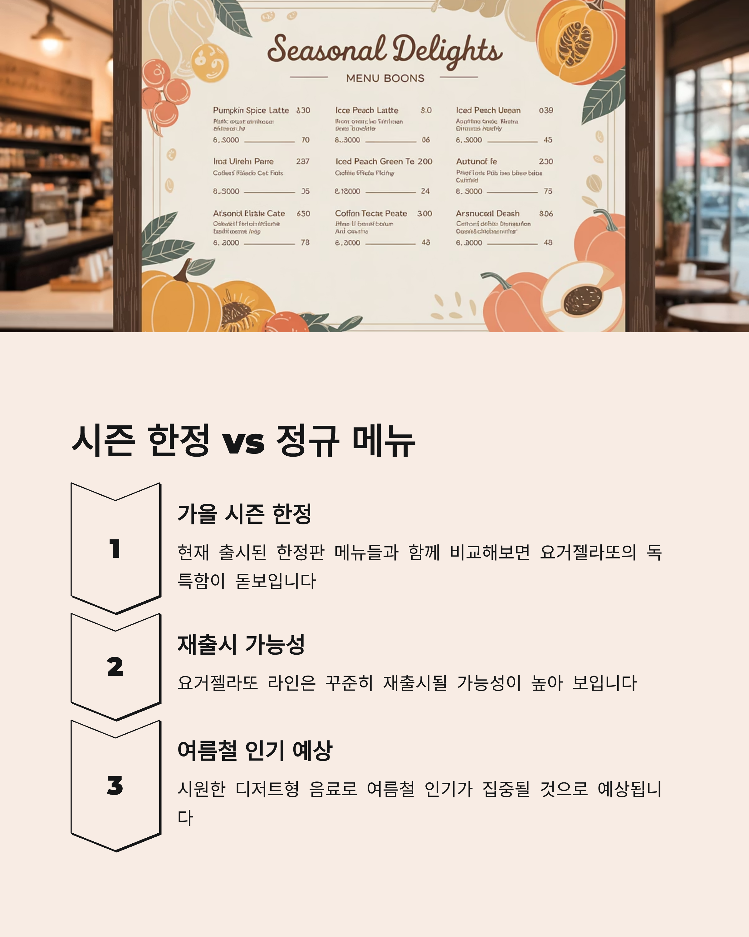 가을 시즌에 맞춰 나온 한정판 메뉴와 함께 비교해보면, 요거젤라또 라인은 꾸준히 재출시될 가능성이 높습니다. 특히 여름철에는 시원한 디저트형 음료로 인기가 집중될 것으로 보입니다.
