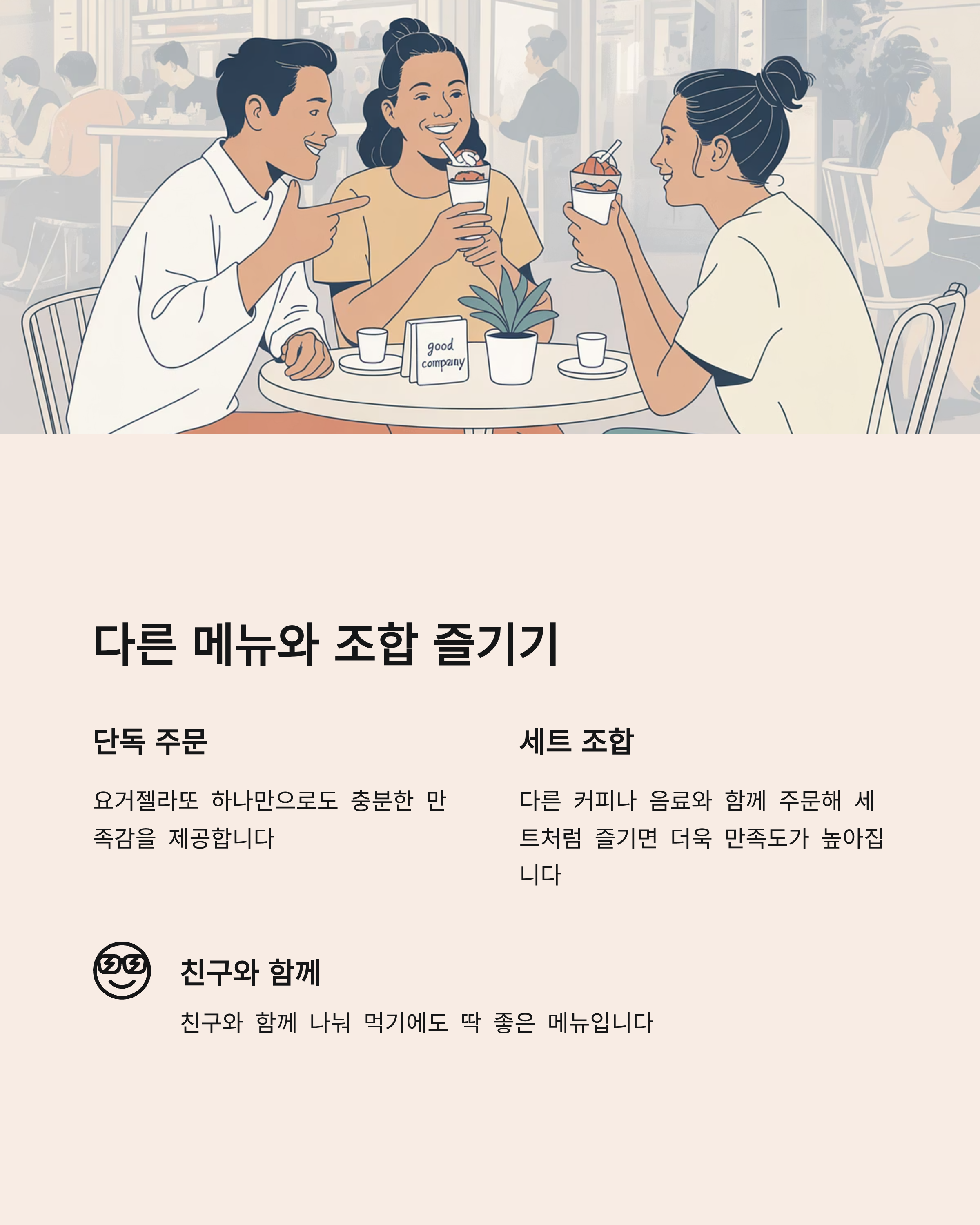요거젤라또는 단독으로 즐기는 것도 좋지만, 다른 커피나 음료와 함께 주문해 세트처럼 즐기면 더욱 만족도가 높아집니다. 친구와 함께 나눠 먹기에도 딱 좋은 메뉴입니다.