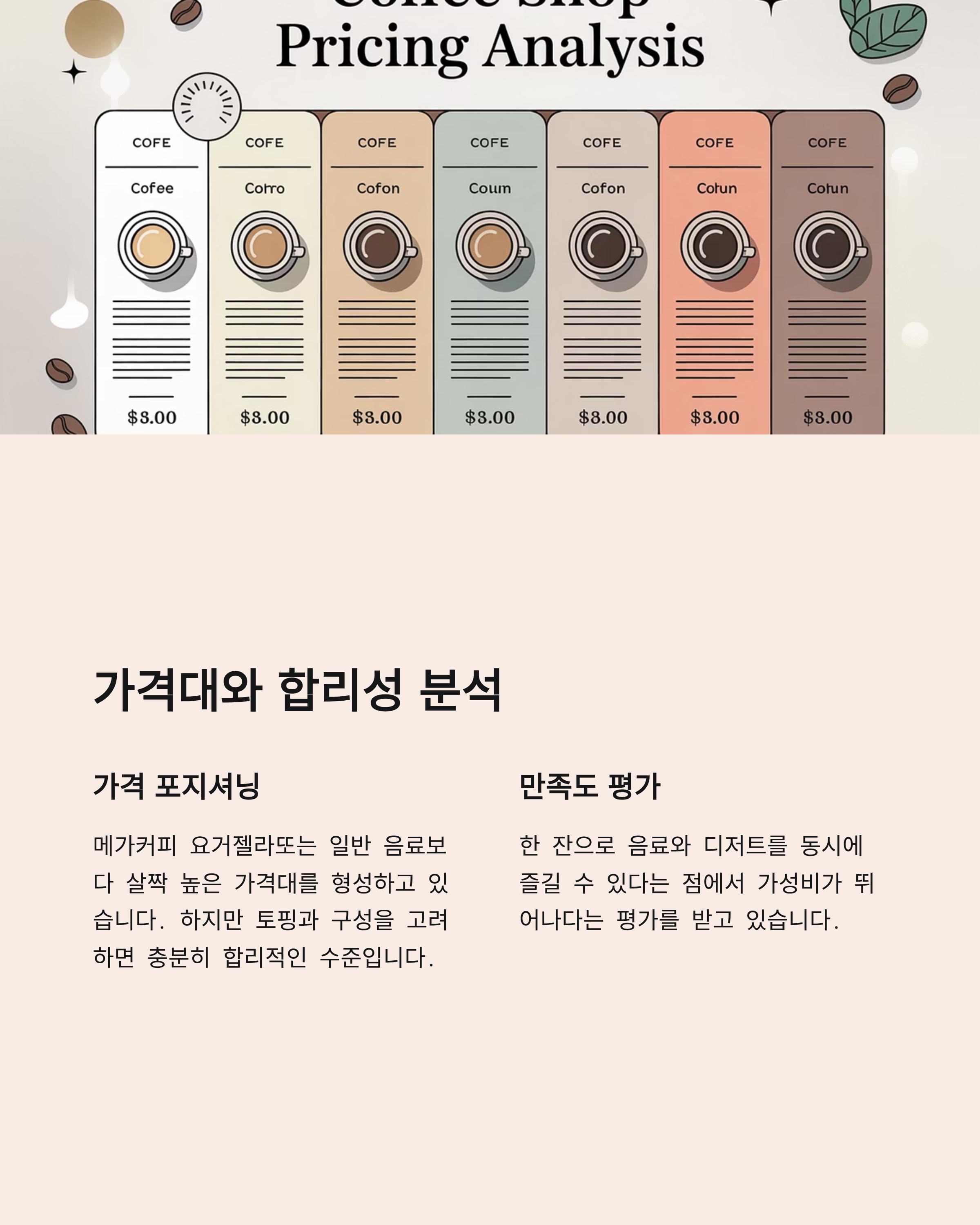 메가커피 요거젤라또는 일반 음료보다 살짝 높은 가격대지만, 토핑과 구성으로 본다면 만족도가 높습니다. 한 잔으로 음료와 디저트를 동시에 즐길 수 있다는 점에서 합리적이라는 평가가 많습니다.