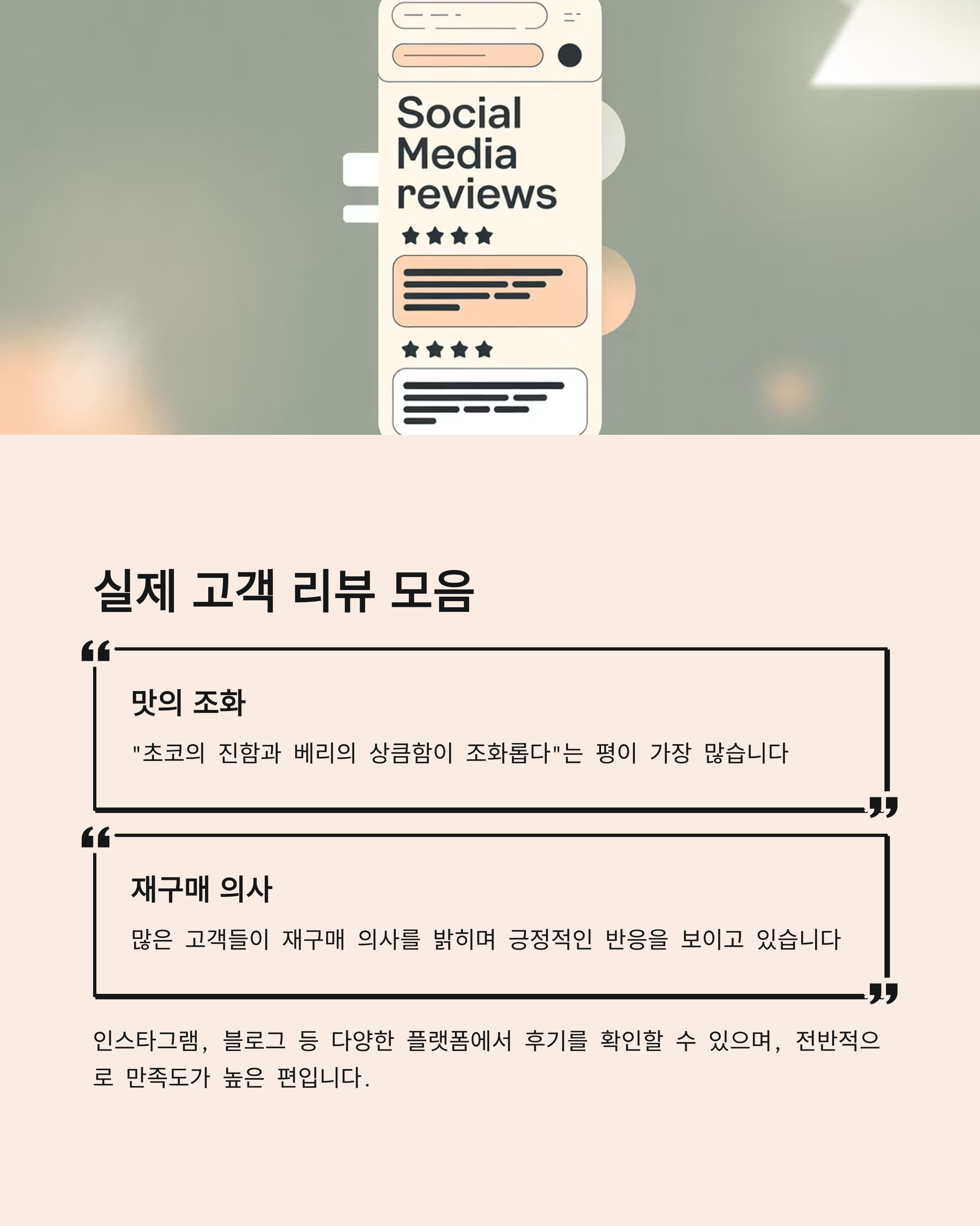 많은 소비자들이 인스타그램, 블로그 등에서 후기를 남기고 있습니다. "초코의 진함과 베리의 상큼함이 조화롭다"는 평이 많으며, 재구매 의사가 있다는 후기도 자주 보입니다.