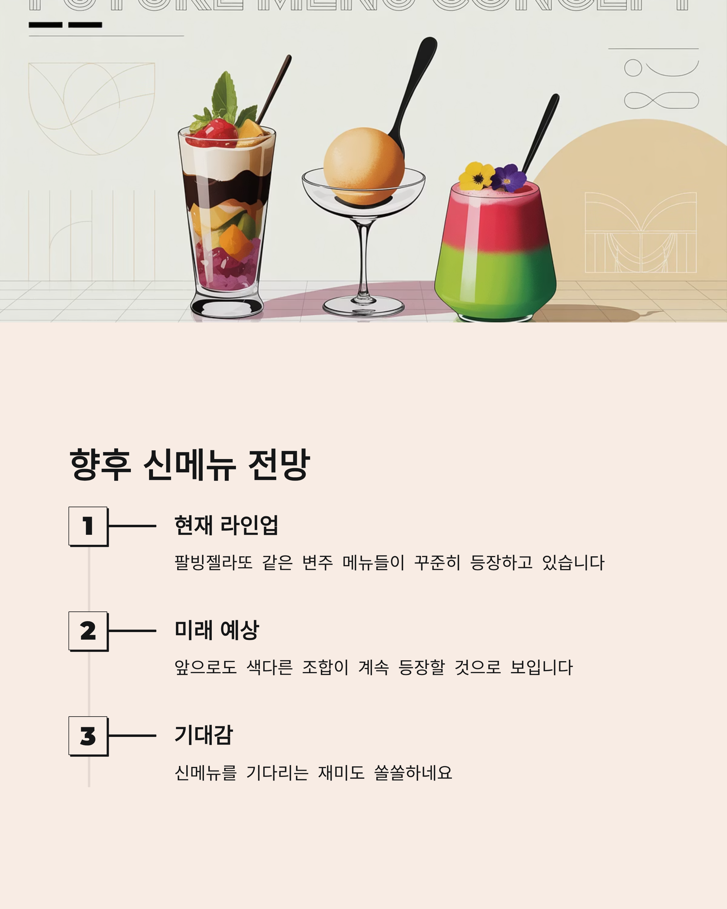 팔빙젤라또 같은 변주 메뉴들이 꾸준히 등장하고 있어, 앞으로도 색다른 조합이 계속 등장할 것으로 보입니다. 신메뉴를 기다리는 재미도 쏠쏠하네요.