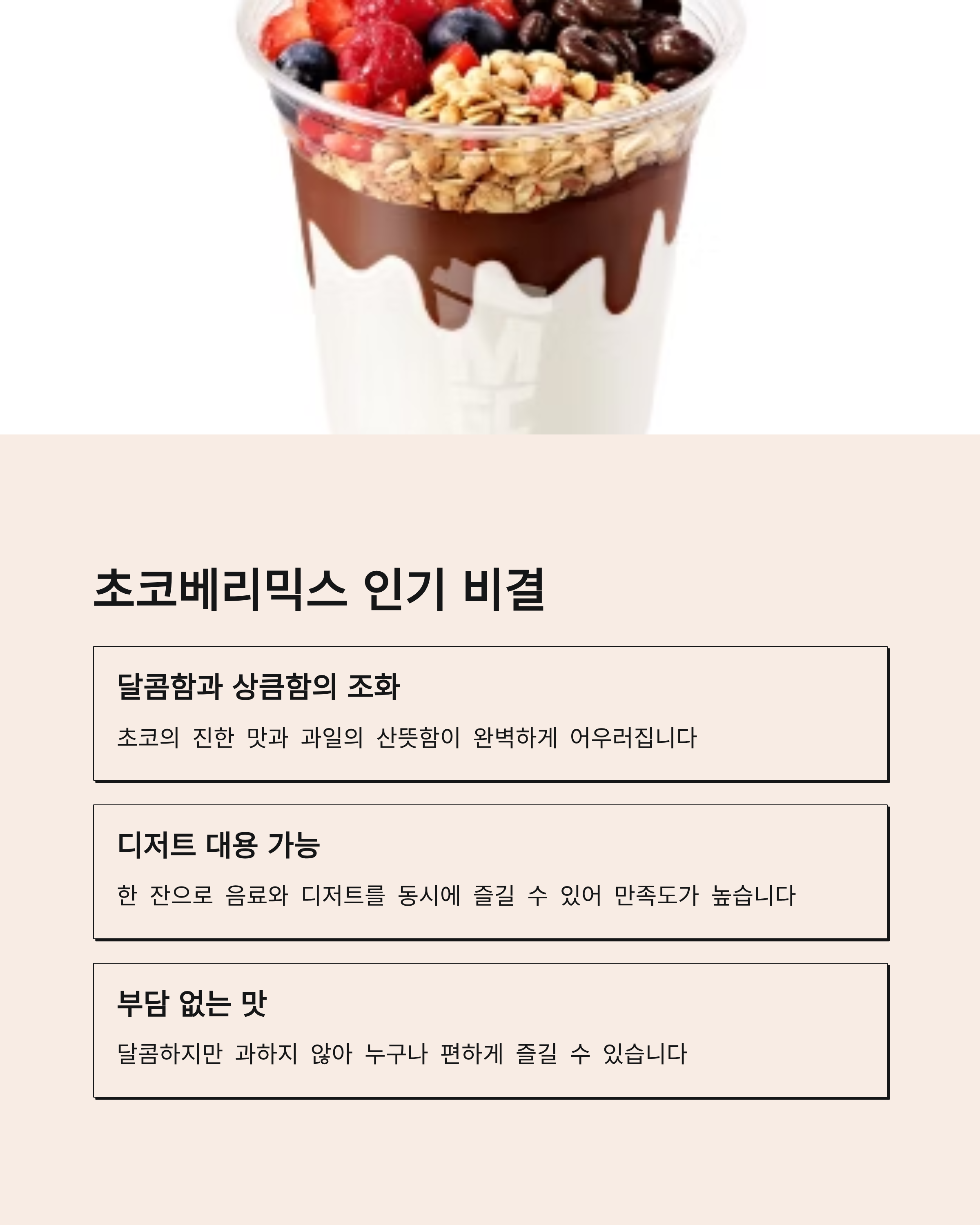 달콤하면서도 상큼한 조화가 돋보이는 초코베리믹스는 디저트 대용으로도 손색이 없습니다. 특히 초코의 진한 맛과 과일의 산뜻함이 함께 어울려 부담스럽지 않게 즐길 수 있다는 점이 매력 포인트입니다.