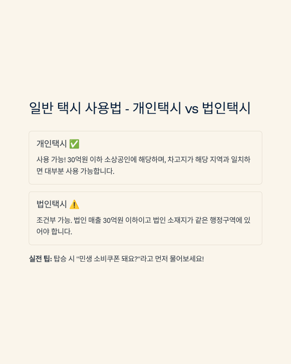 개인 택시 ✅ 사용 가능 (30억원 이하 소상공인에 해당)