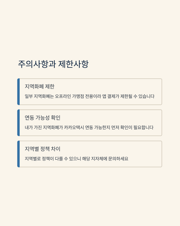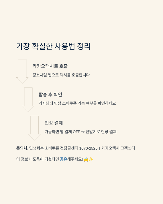 결론: 카카오택시에서 민생회복지원금 사용은 현장 단말기 결제가 가장 확실하며, 지역화폐 연동은 제한적입니다. 탑승 전 반드시 기사님께 확인하세요! 🚖✨