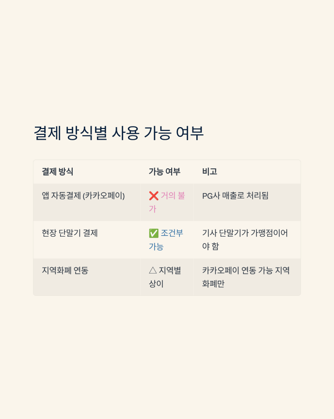 카카오택시 앱을 통한 자동결제는 거의 불가능합니다. 카카오페이나 앱 자동결제는 결제대행사(PG사) 매출로 처리되어 소상공인 직접 매출로 인정되지 않기 때문입니다.