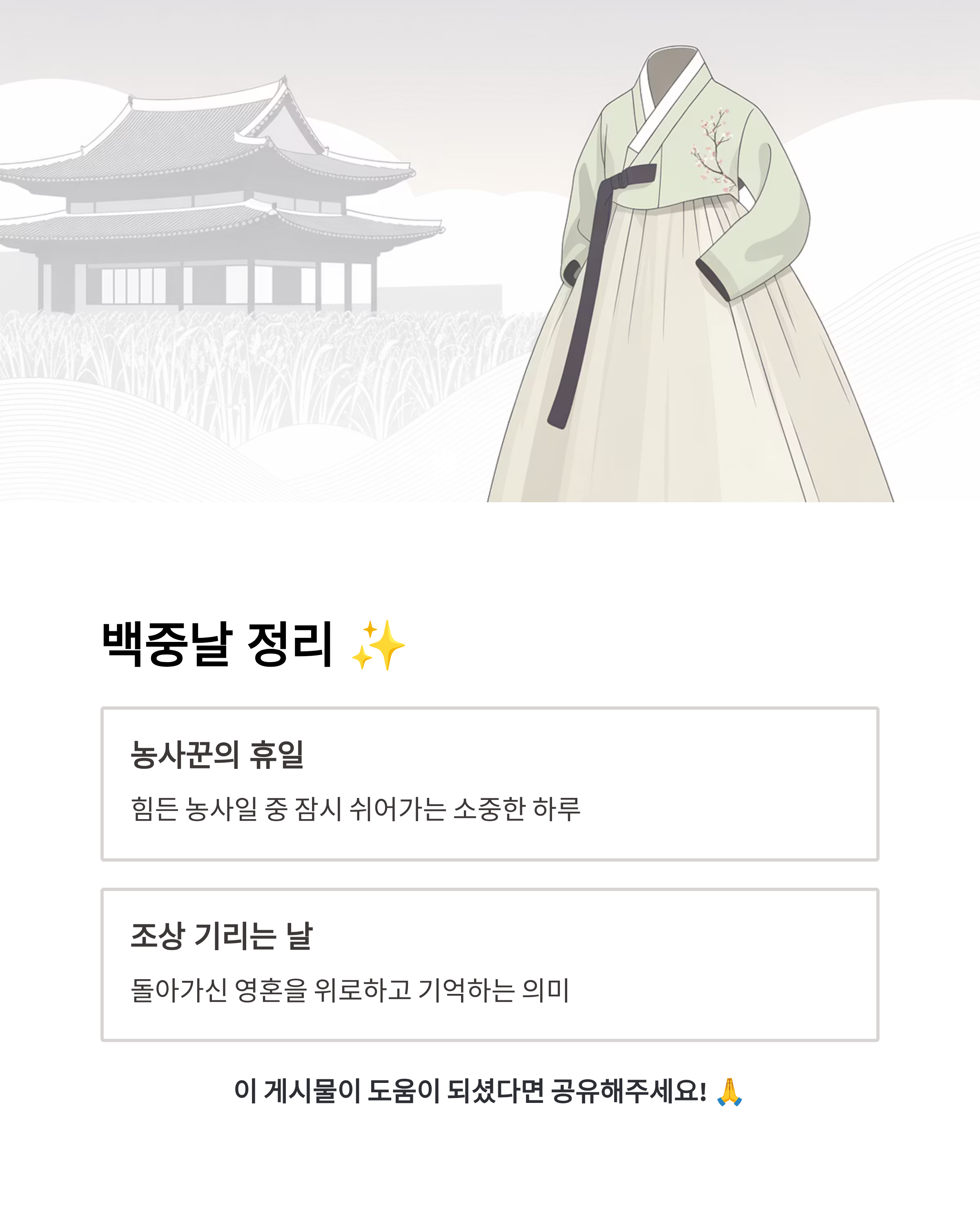 👉 정리하면, 백중날은 농사꾼들의 휴일이자, 조상과 돌아가신 영혼을 기리는 불교 명절이에요.