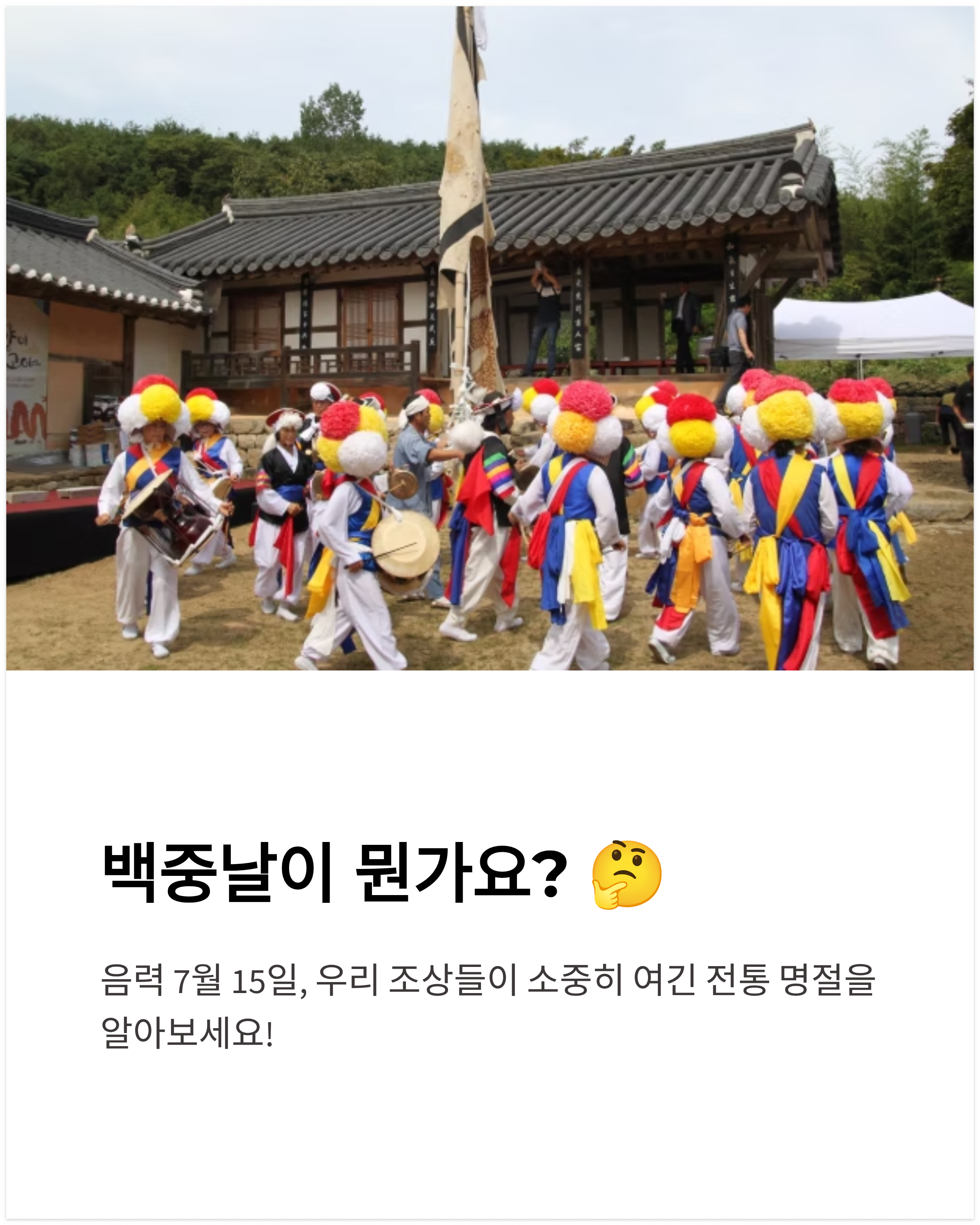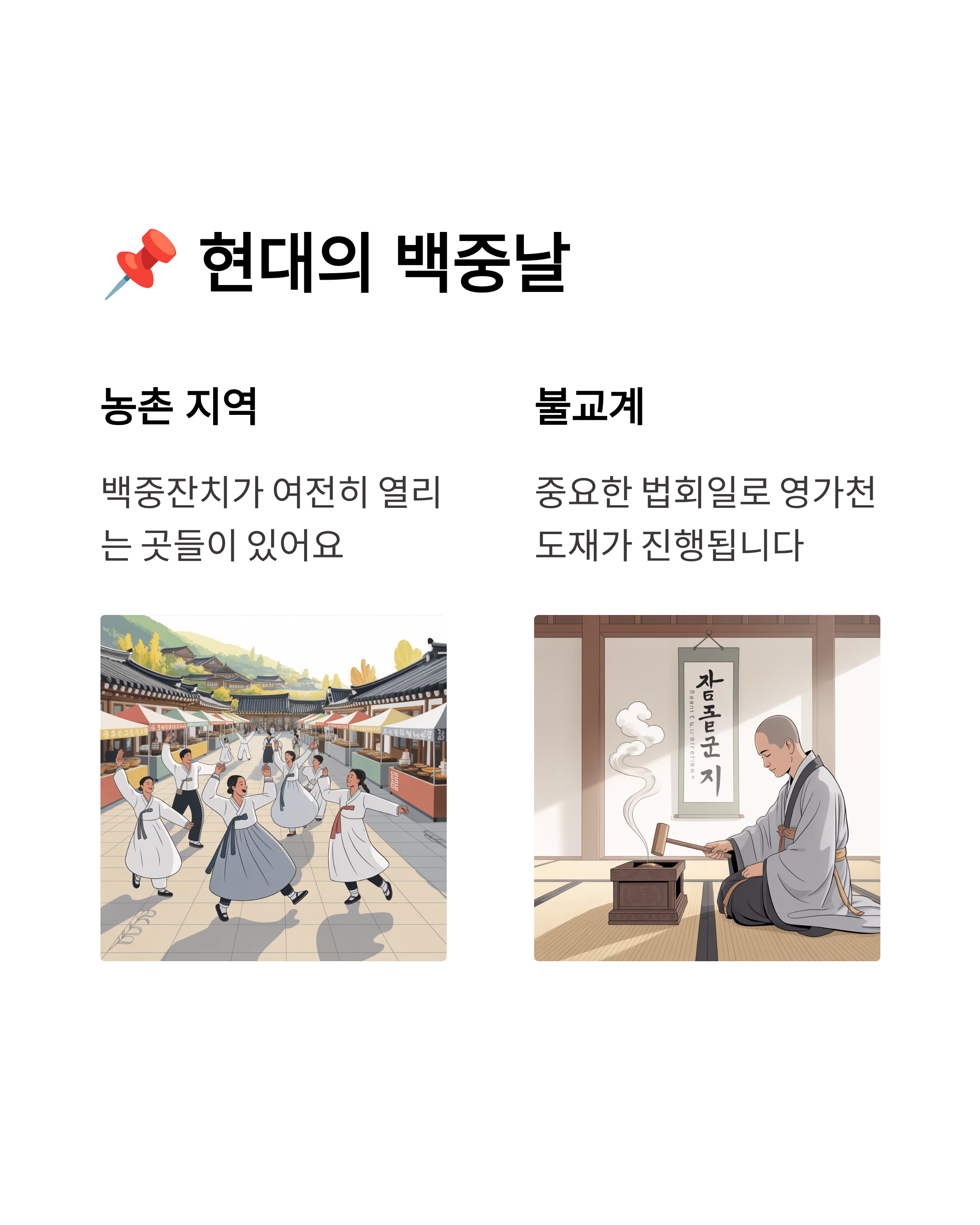 - 예전만큼 큰 명절은 아니지만, 일부 농촌 지역이나 절에서는 여전히 백중재·백중잔치가 열립니다.