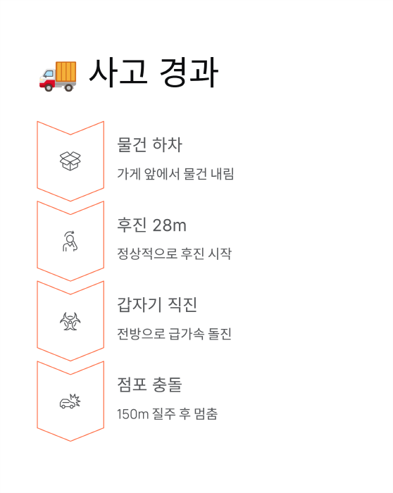 운전자가 가게 앞에서 물건 내린 후 28m 후진하다가 갑자기 전방으로 직진하며 사고 났어. 트럭이 시장 길을 따라 사람들을 치고, 점포를 들이받아 멈췄어. 부상자 18명 중 3명 긴급환자(의식장애), 6명 응급, 9명 비응급. 심정지 2명은 병원서 사망 확인됐고, 초기 21명 보고 후 중복으로 20명 정정.