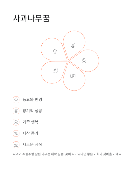 사과꿈은 대부분 길몽! 특히 빨간사과·사과먹는꿈·사과따는꿈은 재물·성공 예고. 썩은사과만 조심하면 돼!