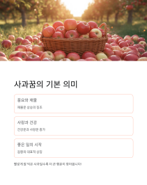어젯밤 나도 사과꿈 꿨는데 아침에 바로 찾아봤어! 사과는 풍요·건강·사랑을 상징해. 기본적으로 좋은 일이 생길 징조야.