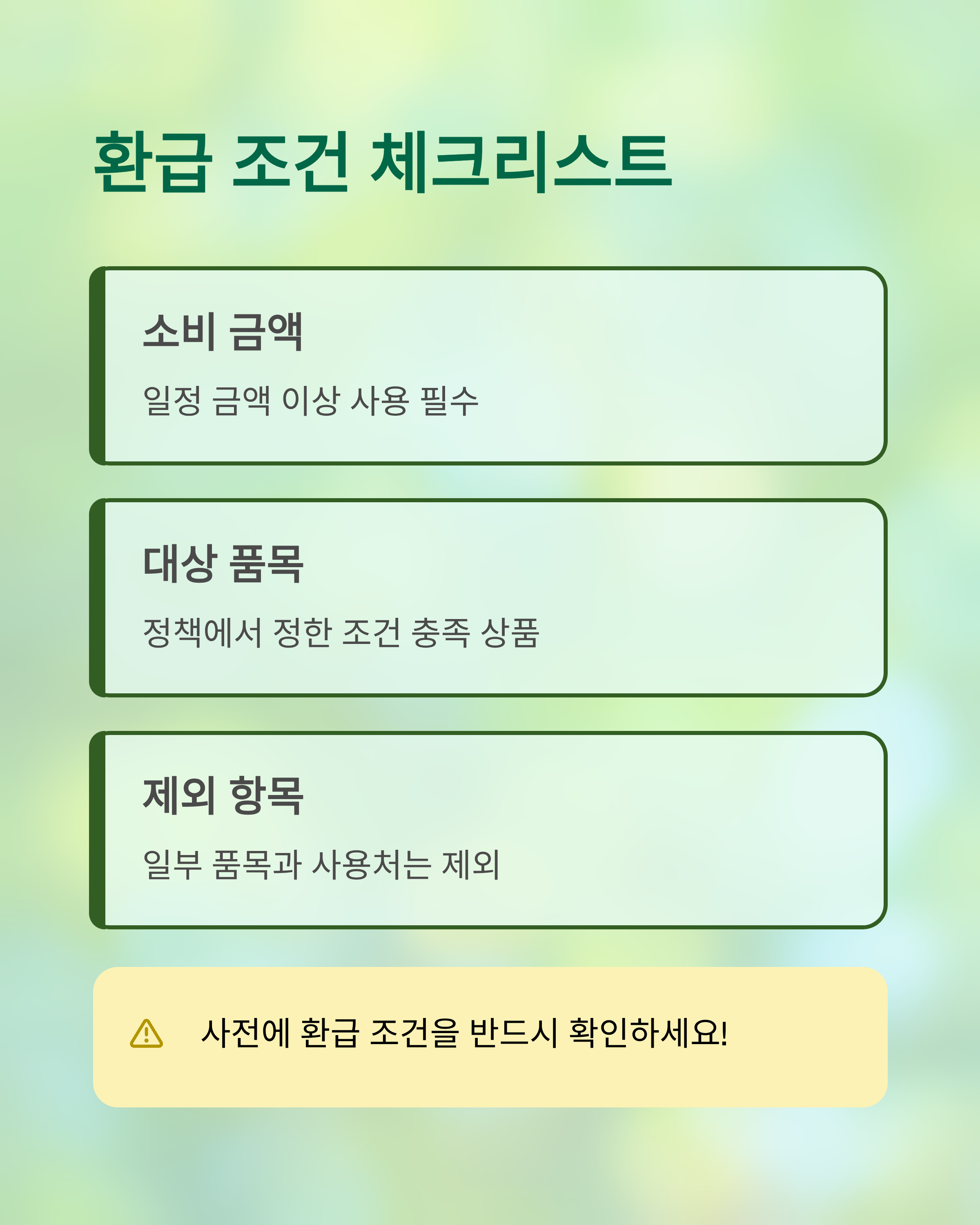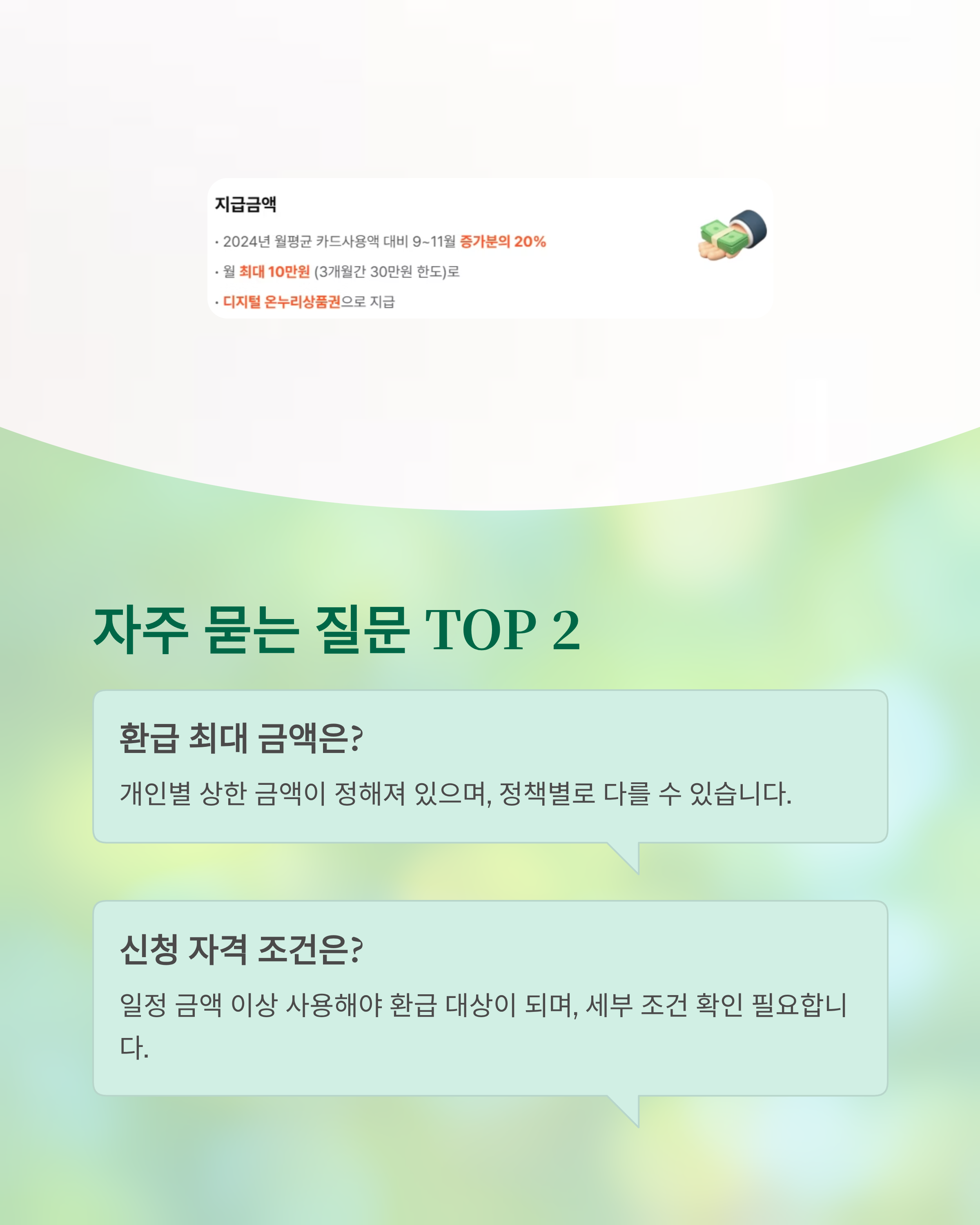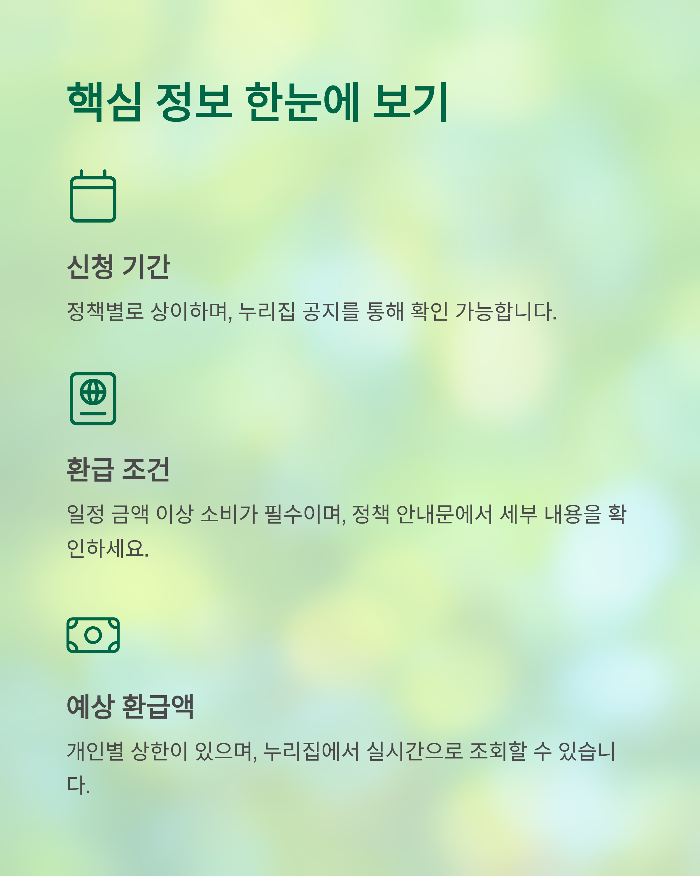 | 환급 조건 | 일정 금액 이상 소비 | 정책 안내문 확인 |