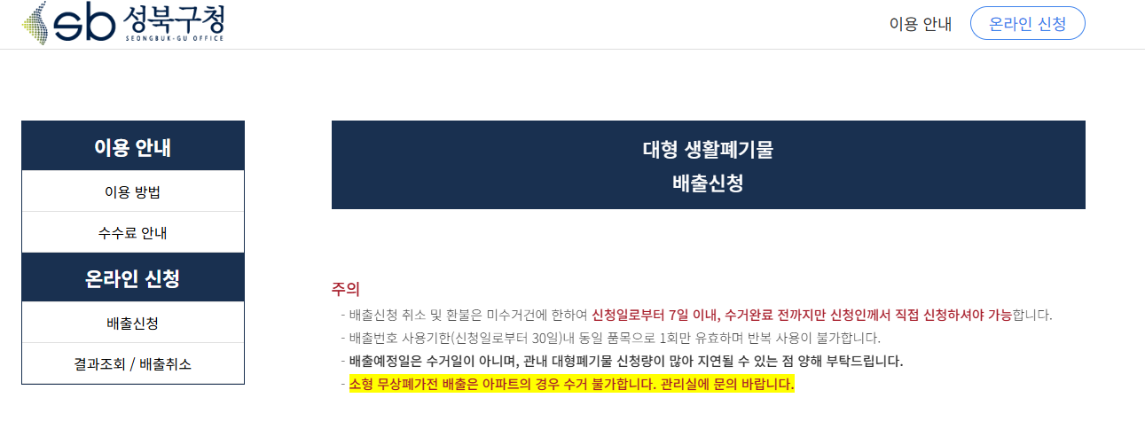 신청서 작성: 성북구 대형폐기물 신청 사이트에서 신청서 작성.