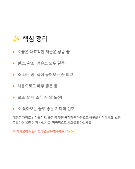 여러분은 어떤 소꿈 꾸신 적 있나요? 그 후에 좋은 일 있었나요? 댓글로 경험담 공유해주세요! 다음 시간에는 '돼지꿈 해몽 완벽 가이드'로 찾아올게요. 기대해주세요! 🐷