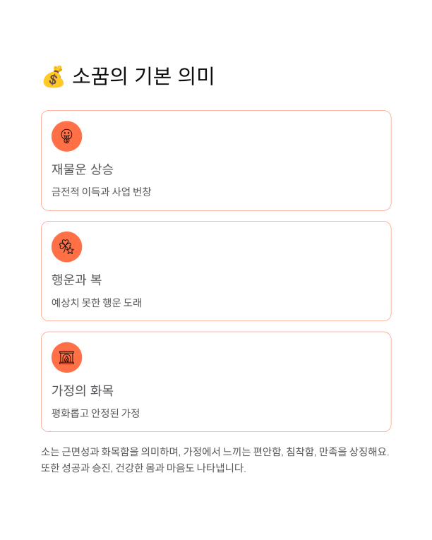 소가 나오는 꿈은 재물운, 태몽, 인간관계 등 다양한 의미를 지니고 있으며, 소는 일반적으로 풍요와 부를 뜻해요. 어젯밤 소꿈 꾸셨나요?
