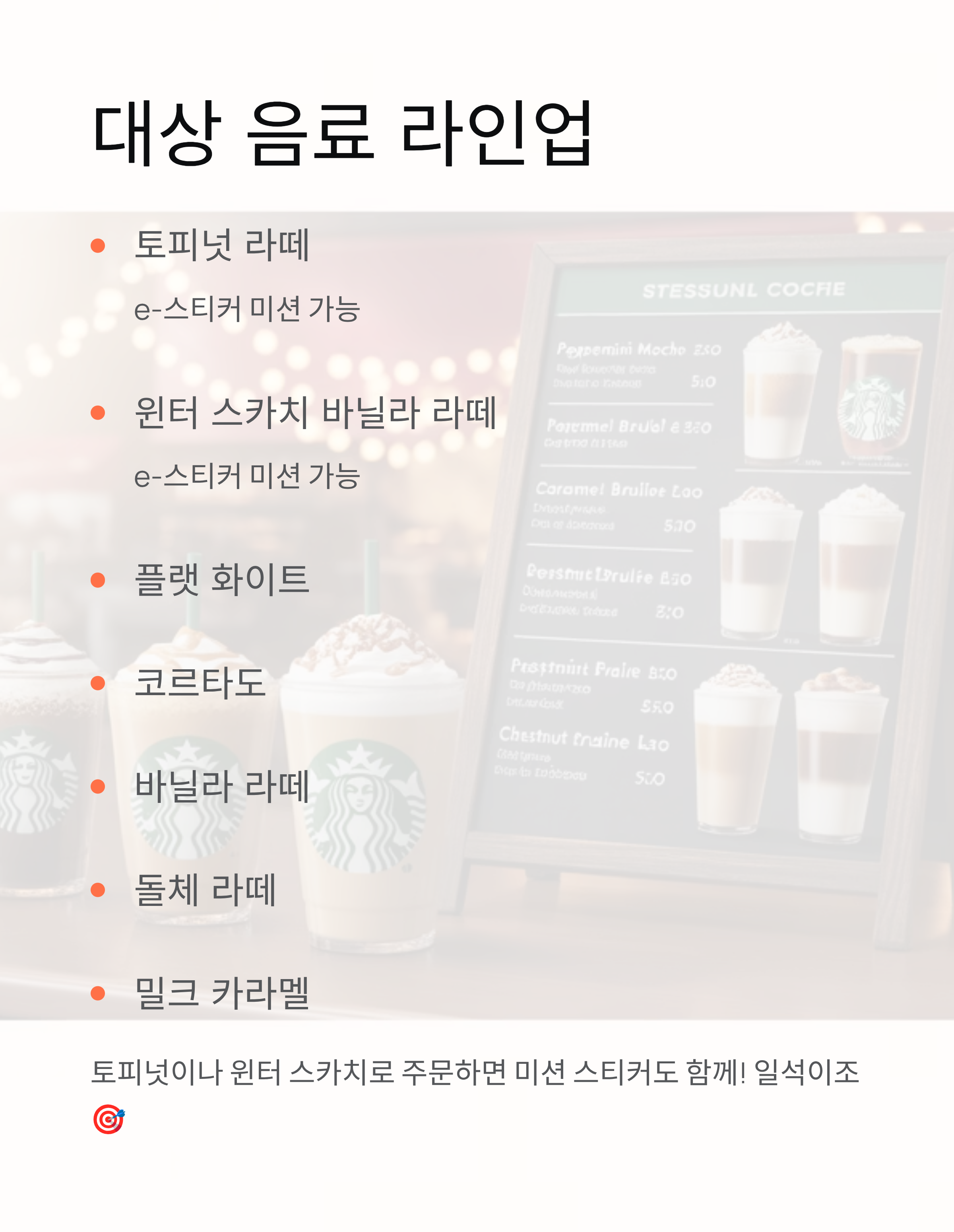 특히 e-스티커 모으시는 분들은 토피넛 라떼나 윈터 스카치 바닐라 라떼로 주문하면 미션 스티커도 함께 받을 수 있으니 일석이조죠 🎯