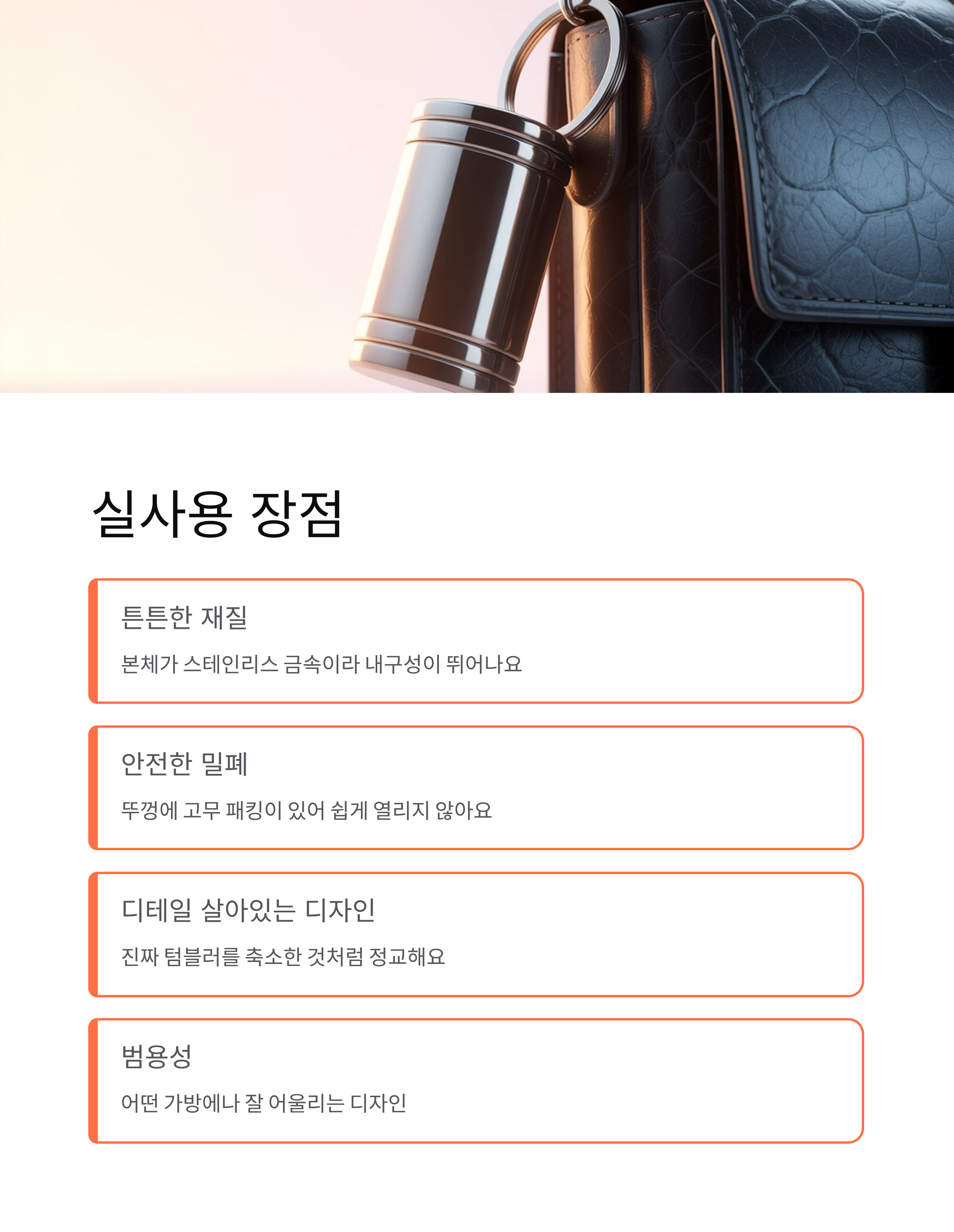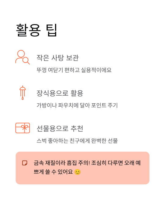 솔직히 말하면 이어폰이나 립밤을 넣으면 뚜껑 여닫을 때마다 좀 불편할 수 있어요. 그래서 저는 작은 사탕이나 그냥 장식용으로 쓰는 걸 추천해요!