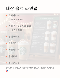 대상 음료는 토피넛 라떼, 윈터 스카치 바닐라 라떼, 플랫 화이트, 코르타도, 바닐라 라떼, 돌체 라떼, 밀크 카라멜 중에서 선택할 수 있어요!