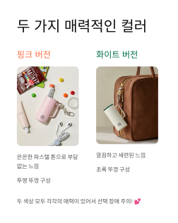 두 가지 색상 모두 정말 예쁜데요, 핑크는 은은한 파스텔 톤이라 부담 없고, 화이트는 깔끔하면서도 세련된 느낌이에요!