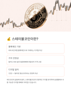 스테이블코인은 비트코인처럼 블록체인 기반으로 거래되지만, 가치가 달러나 유로처럼 법정화폐에 연동된 안정적인 디지털 자산이에요.