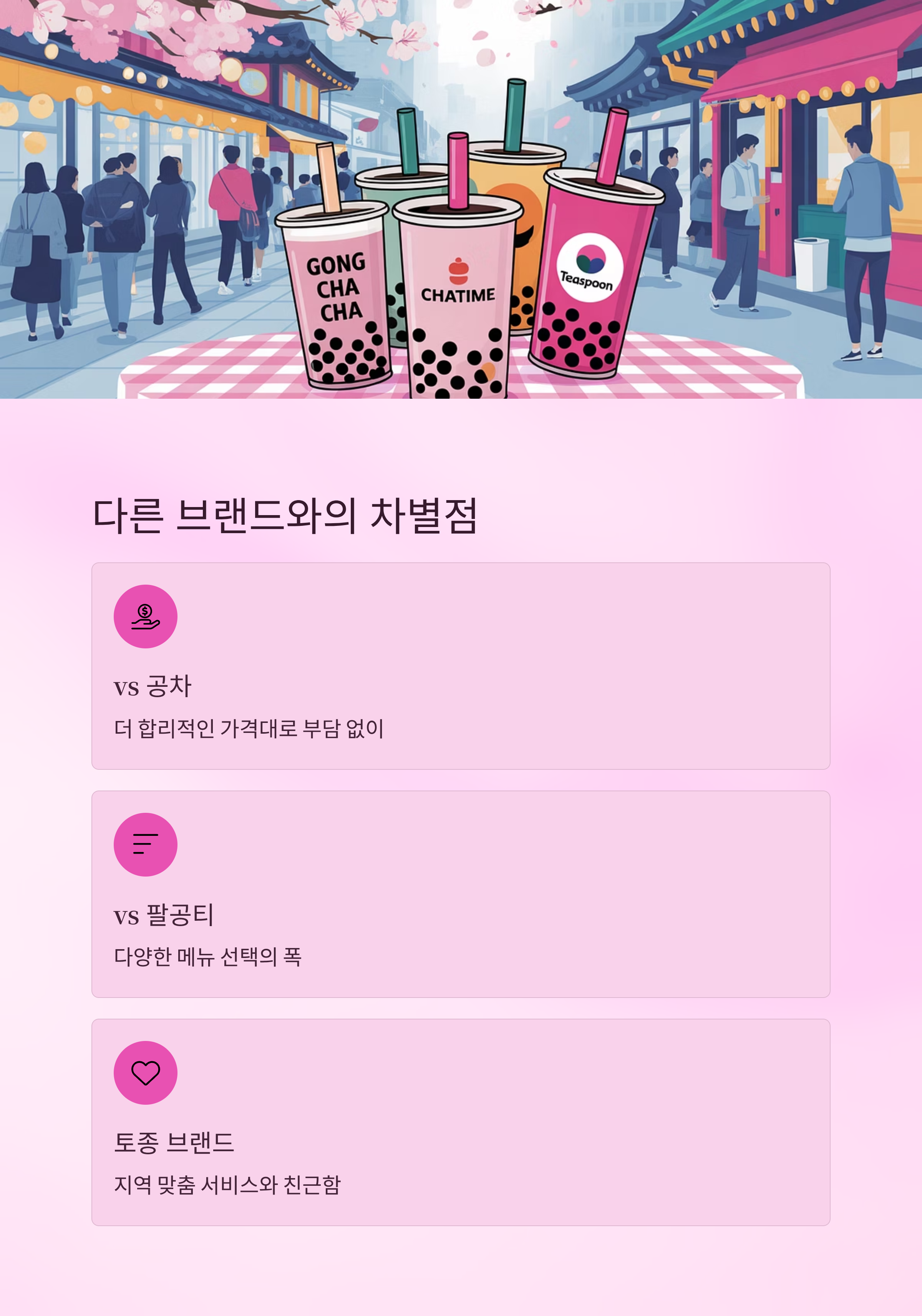 공차와 비교했을 때 가격이 더 합리적이고, 팔공티와 견주면 메뉴 다양성이 돋보입니다. 무엇보다 토종 브랜드로서 지역 맞춤 서비스와 친근함을 강조하며 소비자들에게 꾸준히 사랑받고 있습니다.
