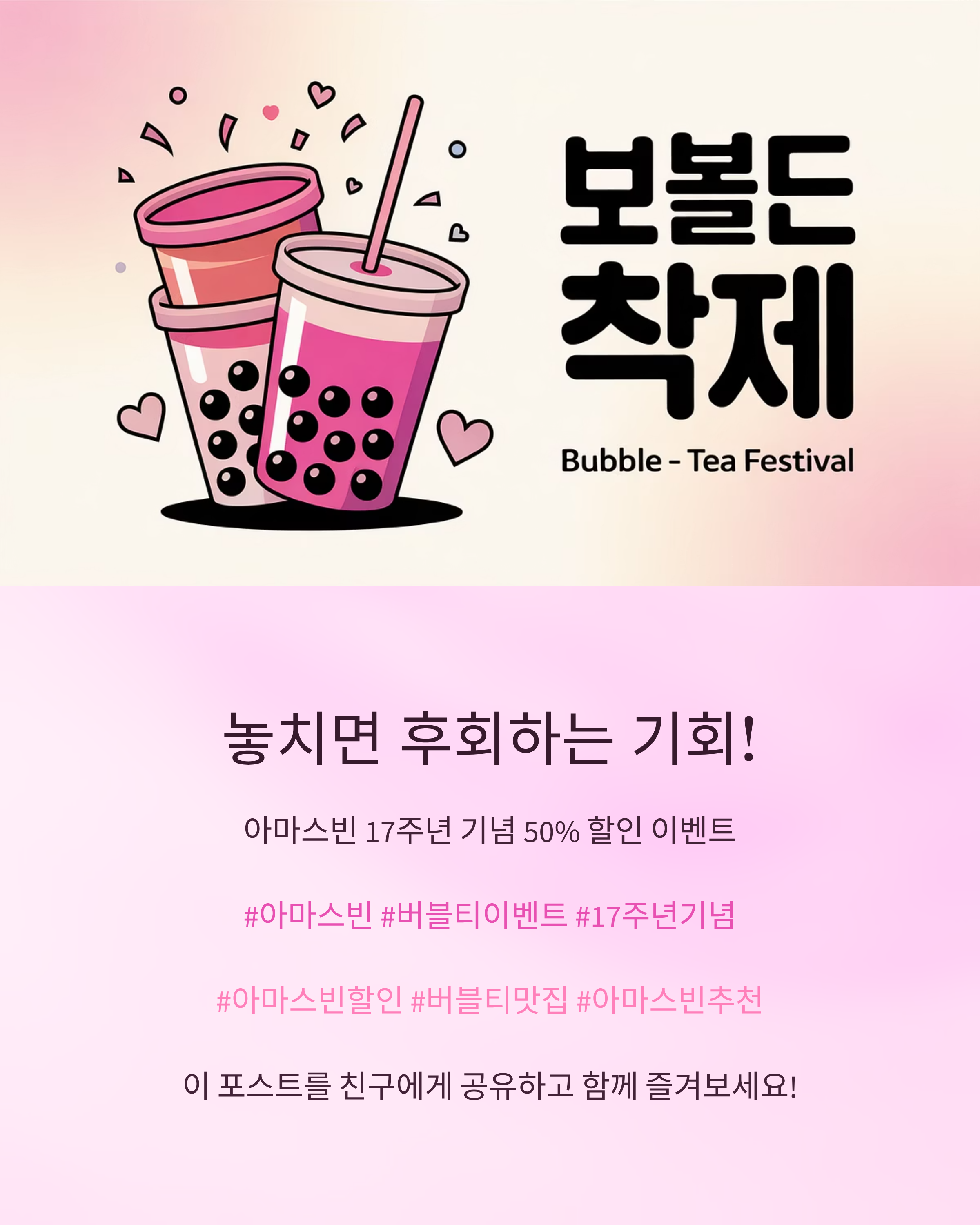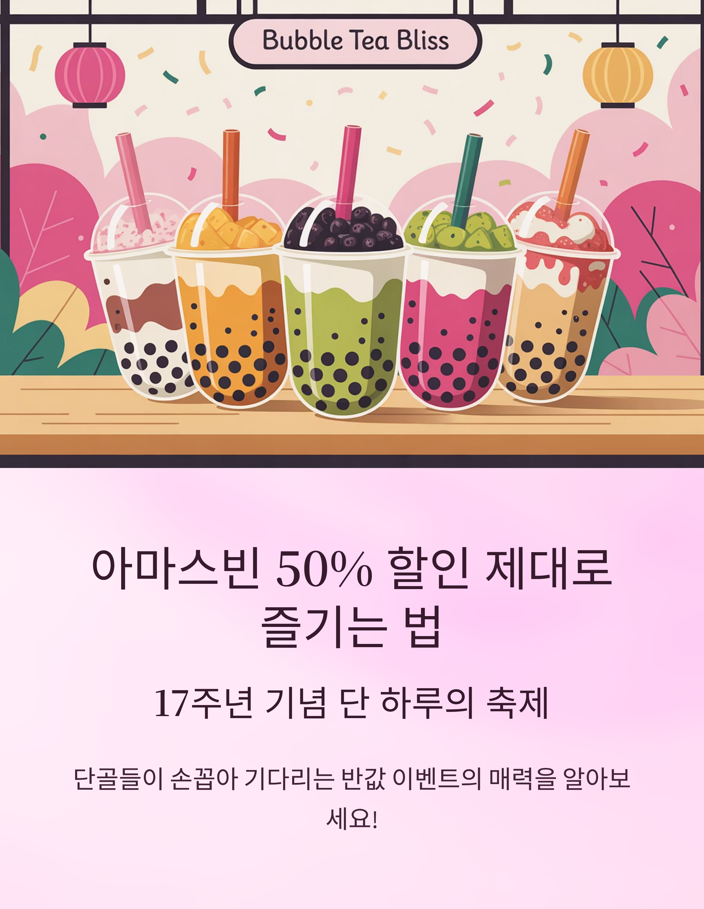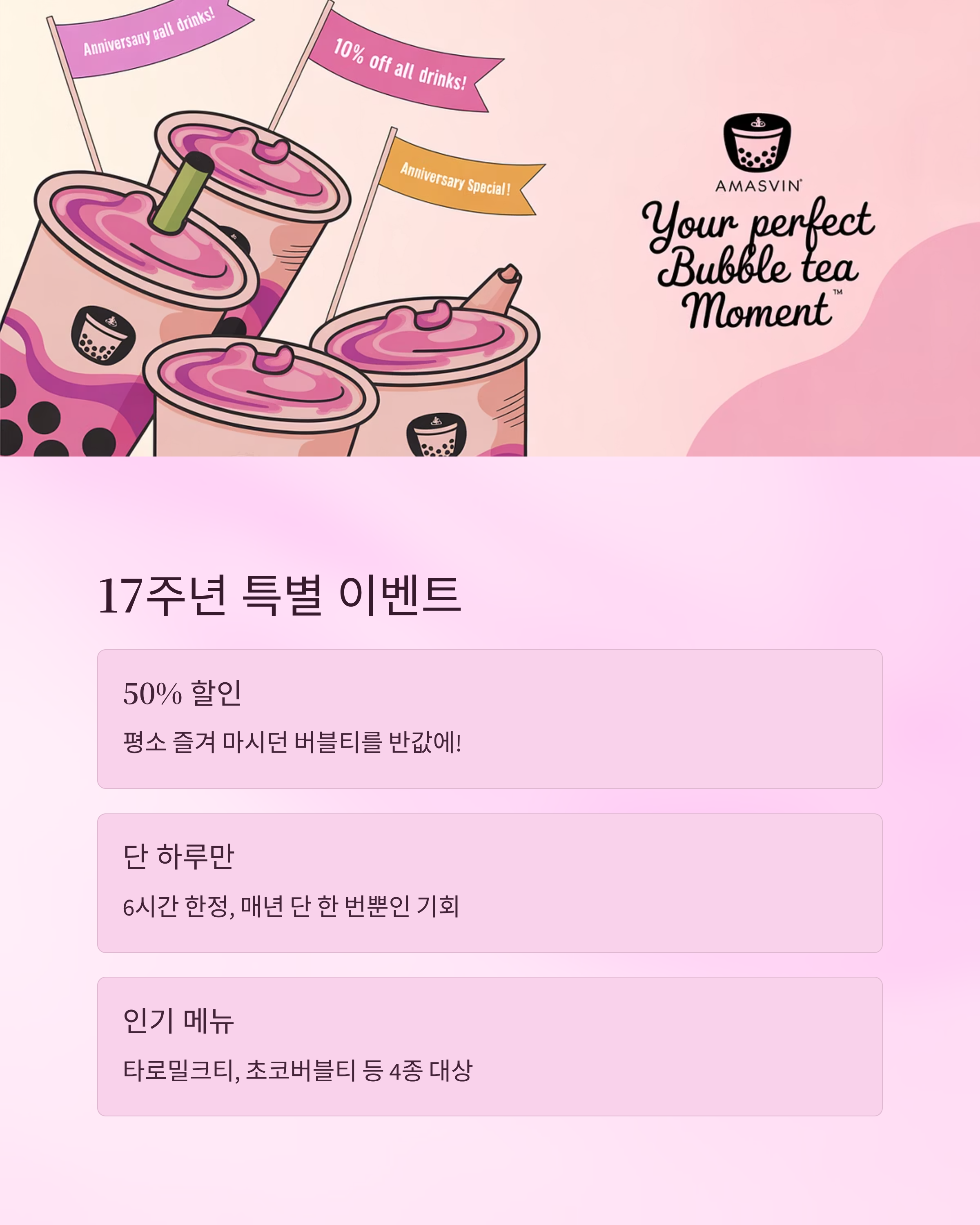 아마스빈이 17주년을 맞아 준비한 50% 할인 이벤트는 평소 즐겨 마시던 버블티를 반값에 즐길 수 있는 특별한 기회입니다. 단 하루, 단 6시간만 진행되는 이번 이벤트는 타로밀크티, 초코버블티, 하동녹차버블티, 딸기요거트 등 인기 메뉴를 대상으로 진행되며, 매년 단 한 번뿐이기에 더욱 소중합니다.