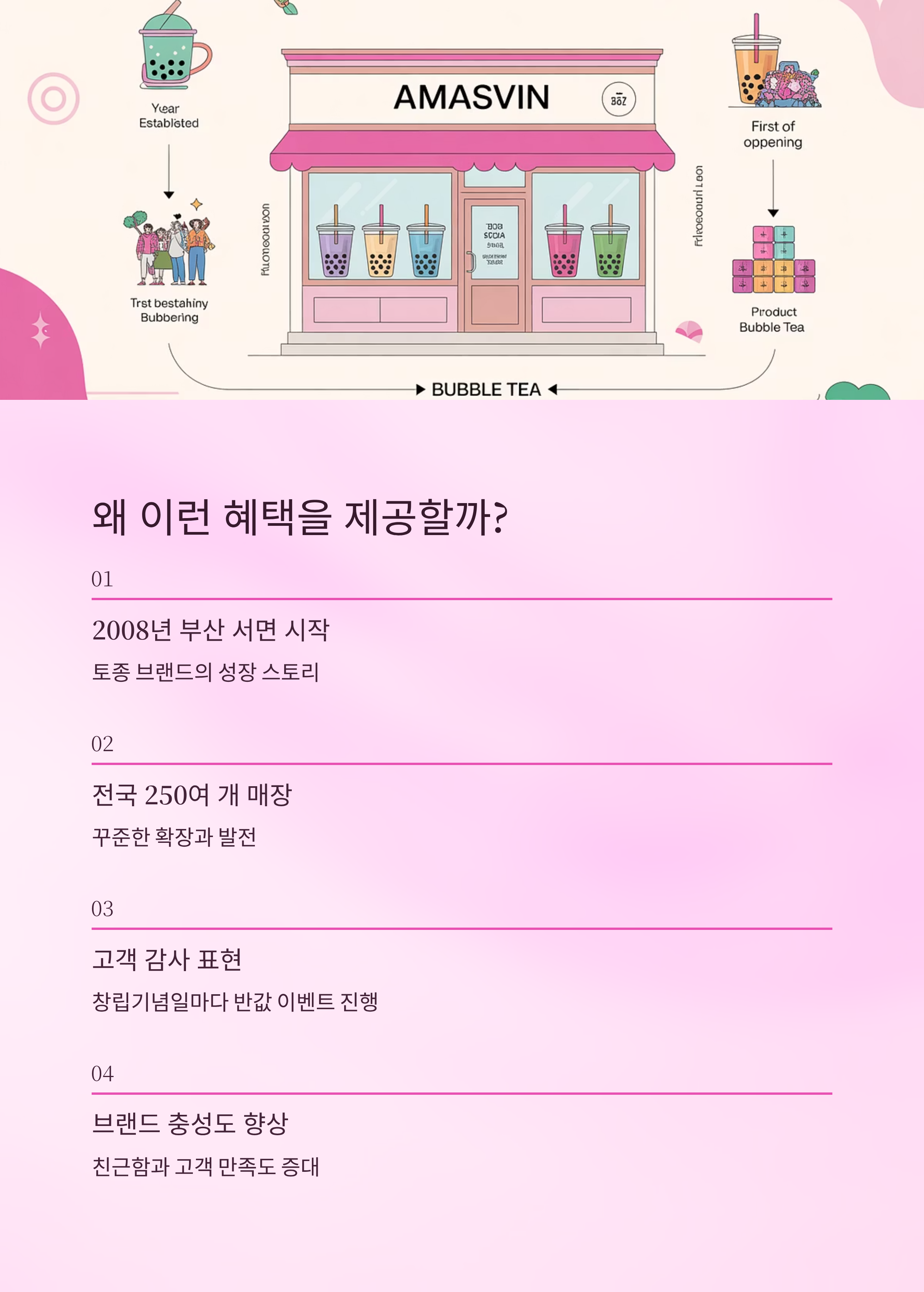 아마스빈은 2008년 부산 서면에서 시작해 전국 250여 개 매장으로 성장했습니다. 매년 창립기념일마다 고객들에게 감사의 마음을 전하는 의미로 반값 이벤트를 진행하고 있으며, 이를 통해 브랜드의 친근함과 고객 충성도를 높여왔습니다.