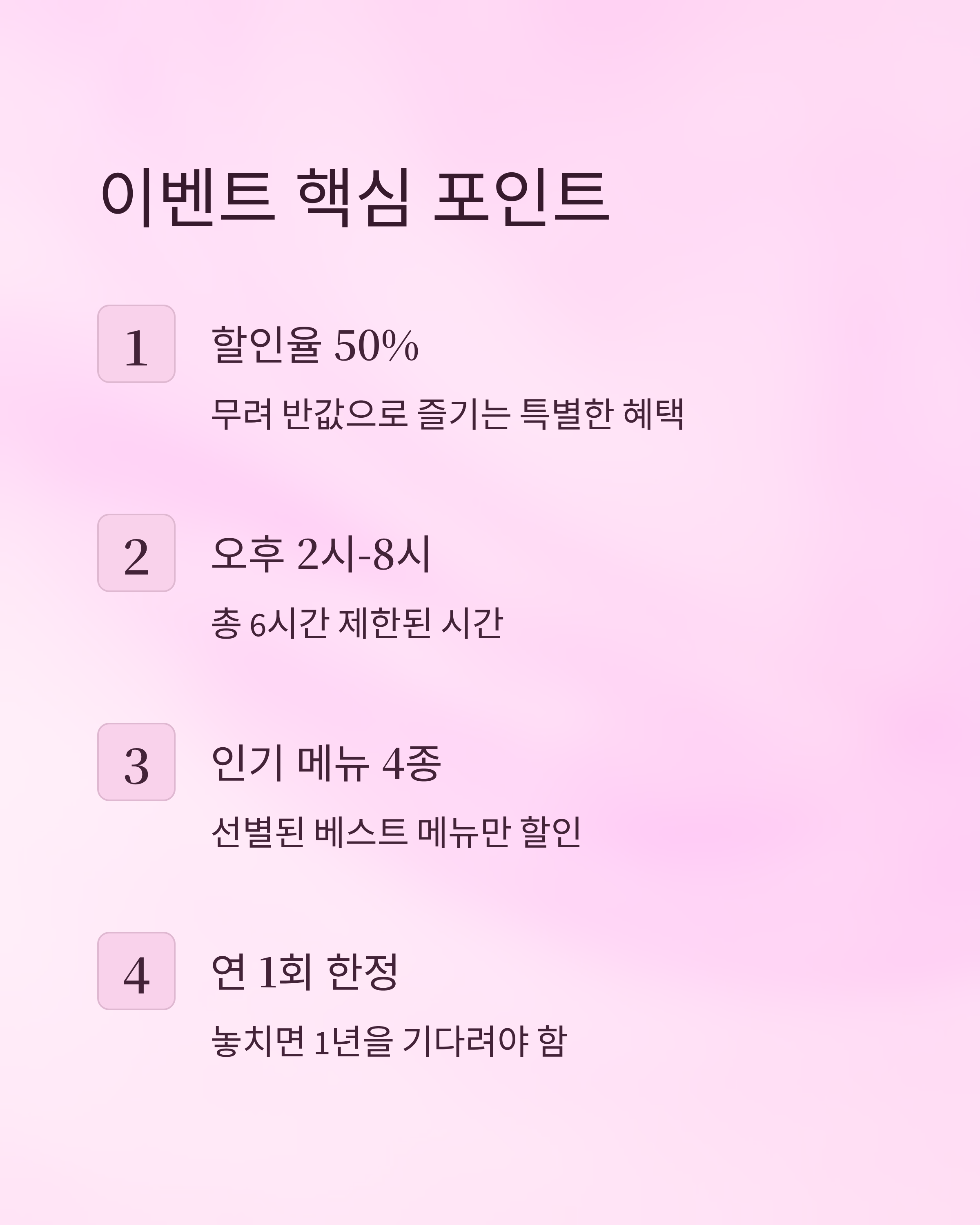 할인율이 무려 반값이라는 점에서 이미 큰 매력을 갖고 있습니다. 진행 시간은 오후 2시부터 8시까지 총 6시간으로 제한되며, 인기 메뉴 4종만 해당됩니다. 매년 창립기념일에만 돌아오기 때문에 놓치면 다시 1년을 기다려야 합니다.