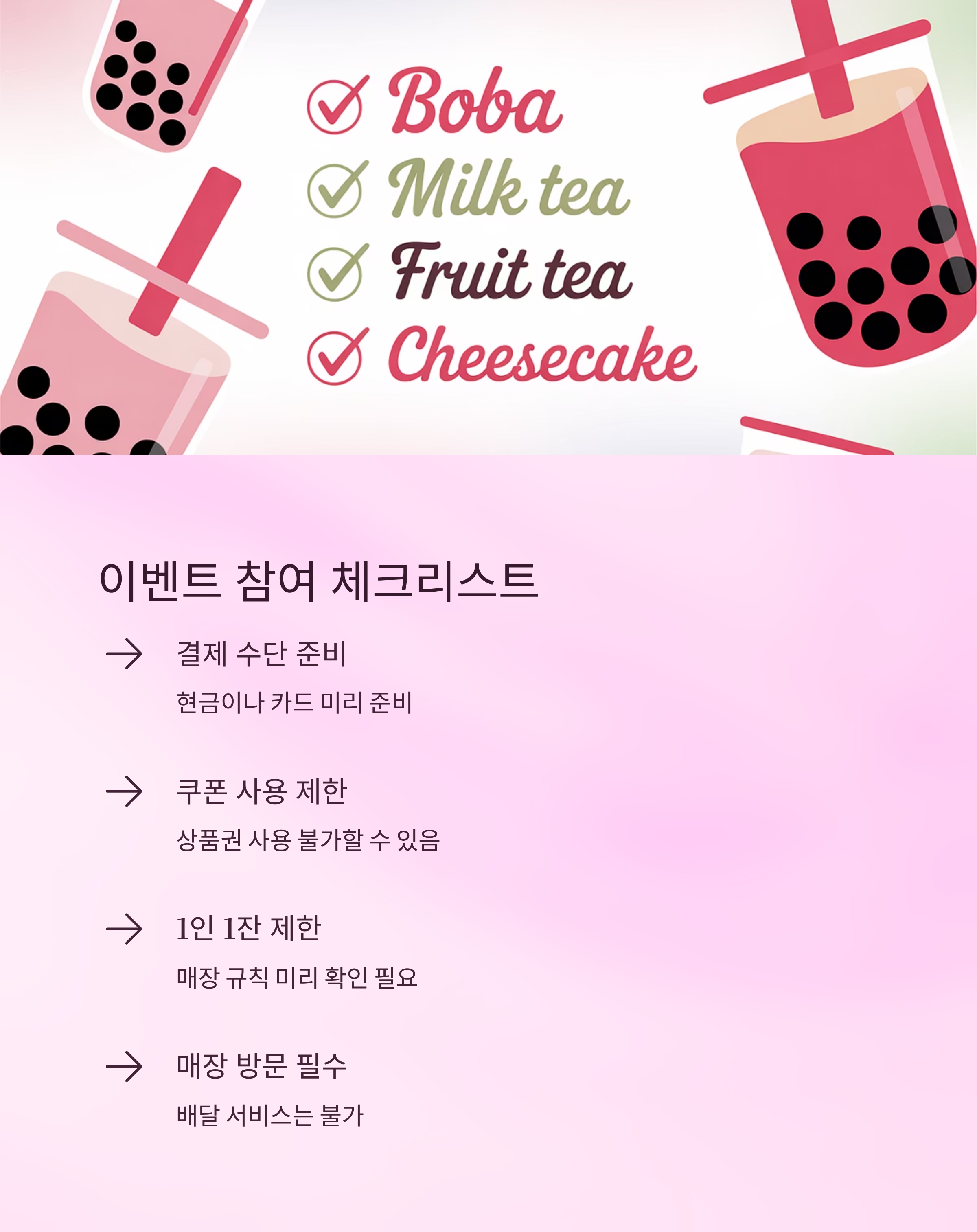 현금이나 카드를 준비하고, 쿠폰이나 상품권 사용이 제한될 수 있다는 점을 유념해야 합니다. 1인 1잔 제한이 있을 수 있으니 매장 규칙도 미리 확인하는 것이 좋습니다. 배달은 불가하므로 매장 방문이 필수입니다.