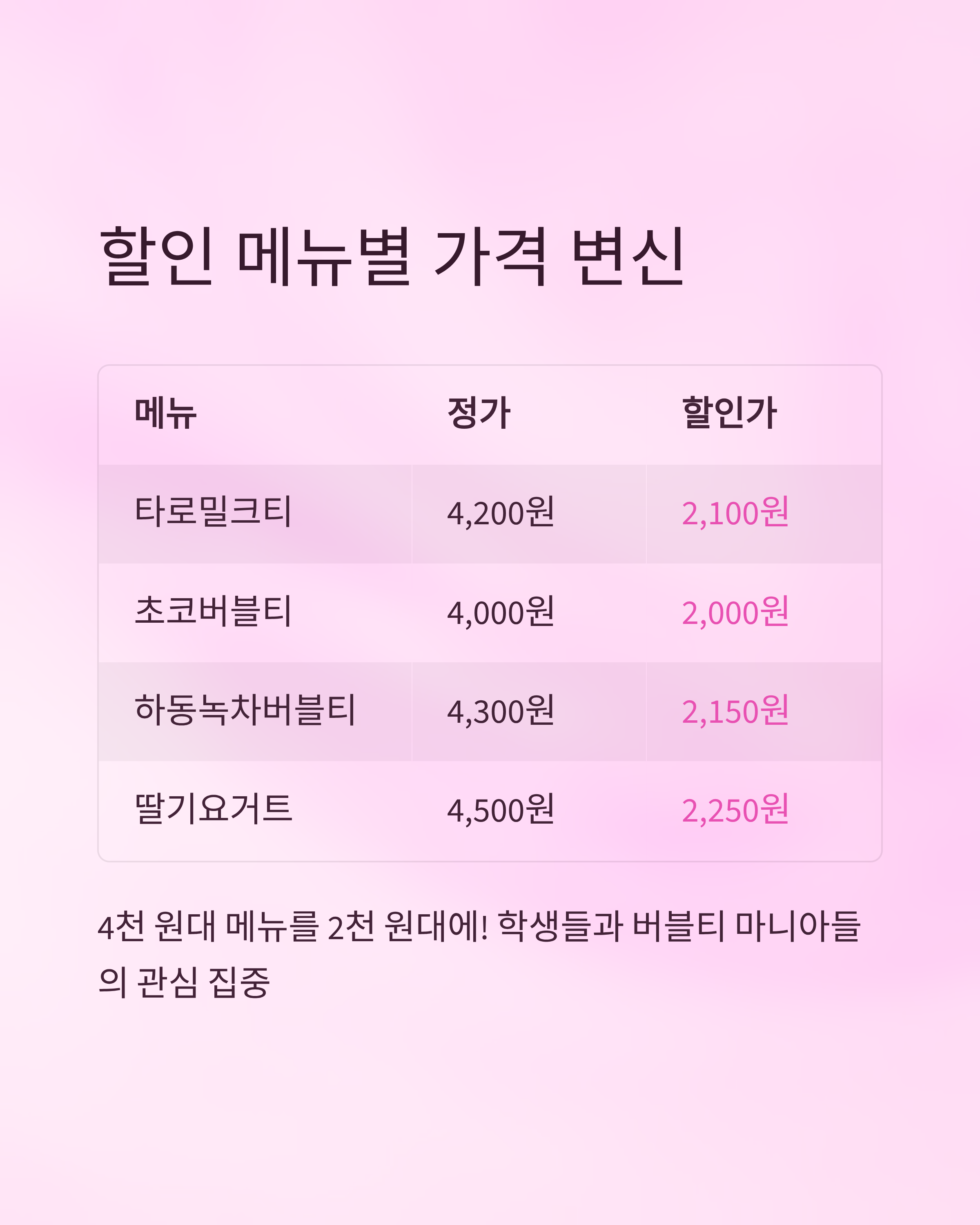 4천 원대 메뉴를 2천 원대에 즐길 수 있다는 점에서 특히 학생들과 버블티 마니아들의 관심을 끌고 있습니다.
