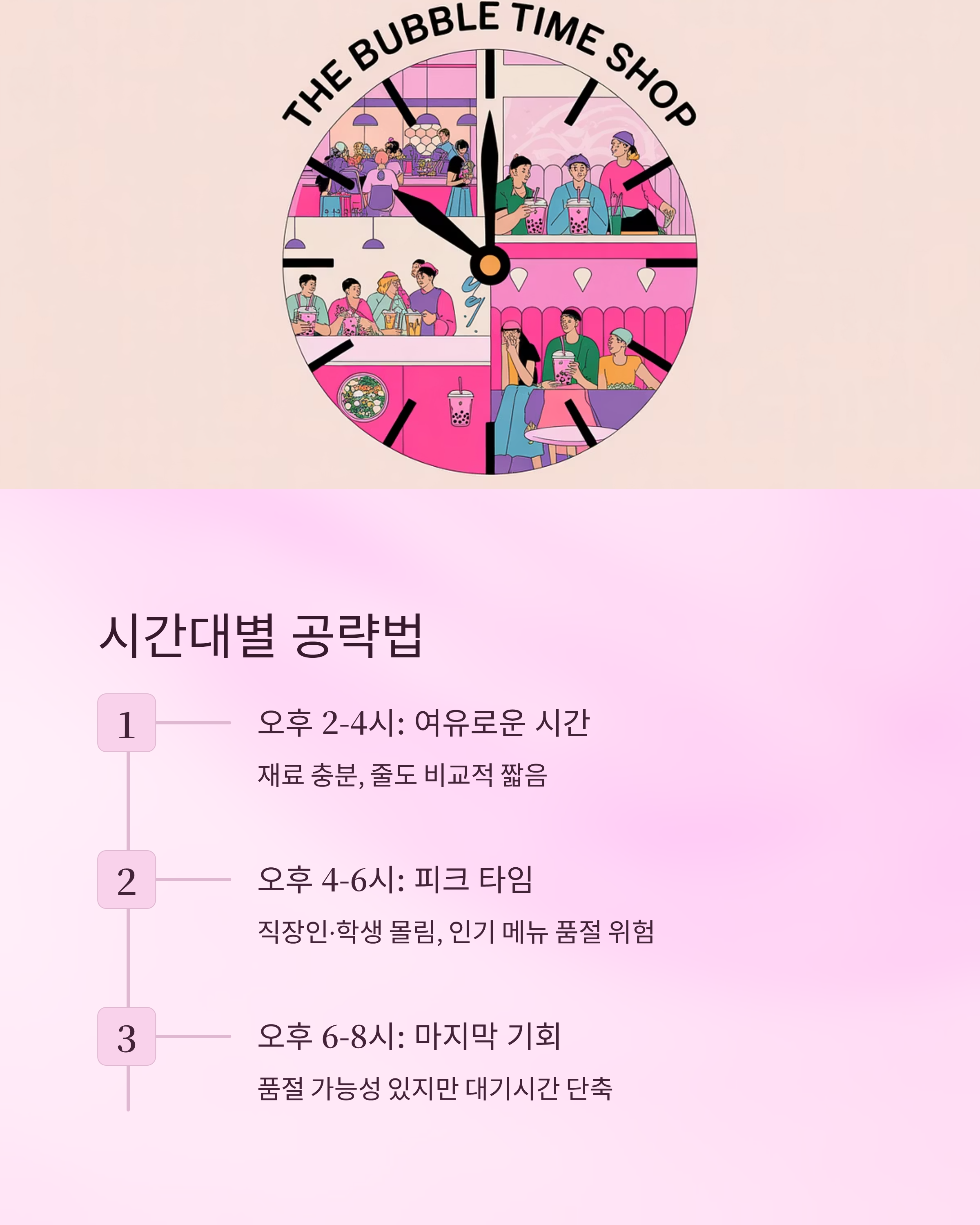 오후 2시에서 4시는 가장 여유로운 시간대로, 재료도 충분하고 줄도 비교적 짧습니다. 반대로 오후 4시에서 6시는 직장인과 학생들이 몰리며 가장 붐비는 시간대라 인기 메뉴가 품절될 수 있습니다. 마지막 6시 이후에는 품절된 메뉴가 있을 수 있지만 대기 시간이 줄어드는 장점이 있습니다.