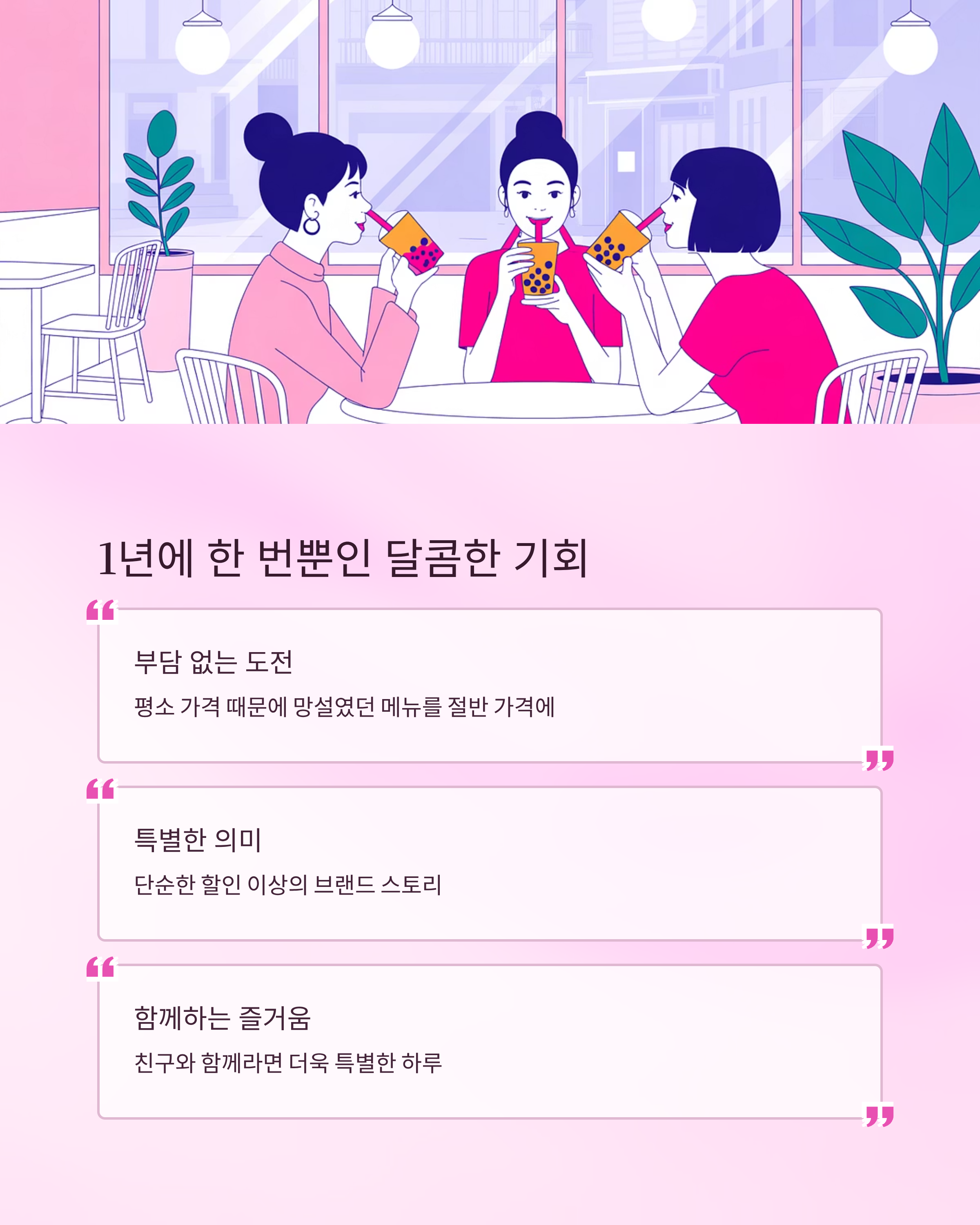 평소 가격 때문에 망설였던 메뉴를 부담 없이 즐길 수 있는 절호의 찬스입니다. 단순한 할인 이상의 의미를 담고 있는 이벤트, 친구와 함께라면 더 특별한 하루가 될 수 있습니다.