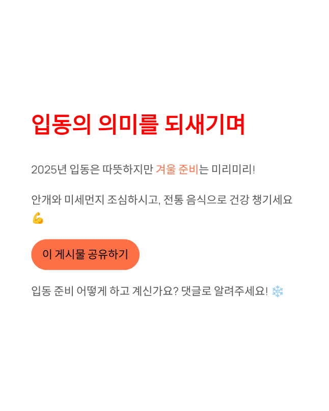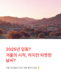 여러분은 올해 입동에 어떤 준비를 하고 계신가요? 벌써 김장을 하셨나요, 아니면 아직 계획 중이신가요? 입동 날씨가 따뜻해서 좋은지, 아니면 이상하게 느껴지시는지 댓글로 의견 나눠주세요! 다음 포스팅에서는 소설(小雪) 절기와 겨울철 건강관리 팁을 가져올게요. 기대해주세요! ❄️