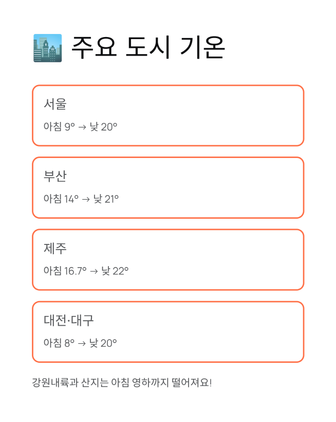 주요 도시 예상 기온을 살펴볼까요? 서울은 아침 9도에서 낮 최고 20도, 부산은 아침 14도에서 낮 최고 21도까지 올라간다고 해요. 광주와 전주도 최고기온이 21도로 포근하겠고, 대전과 대구는 20도로 예상돼요. 제주는 아침 16.7도, 낮 최고 22도로 가장 따뜻하겠네요!