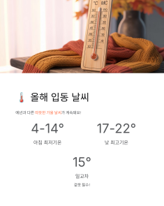 2025년 입동 날씨가 예년과는 많이 달라요! 보통 입동이면 제법 쌀쌀한 날씨를 예상하잖아요? 하지만 올해는 아침 최저기온이 4~14도, 낮 최고기온이 17~22도로 예보됐어요. 겨울이라기보다는 완연한 가을 날씨랍니다.