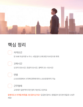 가장 큰 특징은 시험이 없다는 거예요! 정해진 교육시간을 채우고 출석률과 평가점수만 충족하면 자격증을 받을 수 있어요.