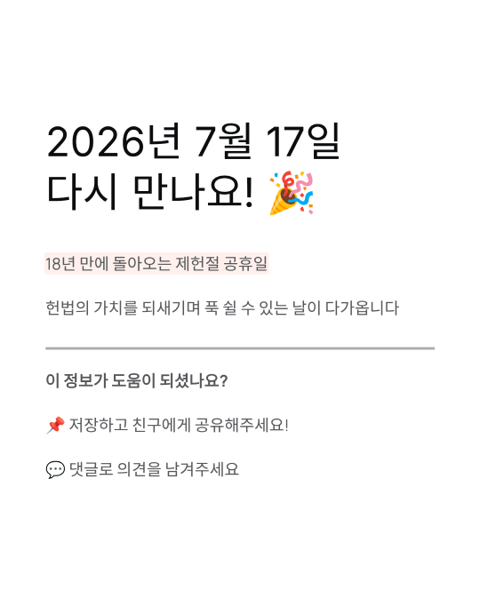 법안이 예정대로 통과된다면 2026년 7월 17일 목요일(또는 요일에 따라)이 공휴일이 돼요! 18년 만에 제헌절에 푹 쉴 수 있게 되는 거죠. 여름 휴가 계획을 세우시는 분들은 이 날짜를 꼭 기억해두세요!