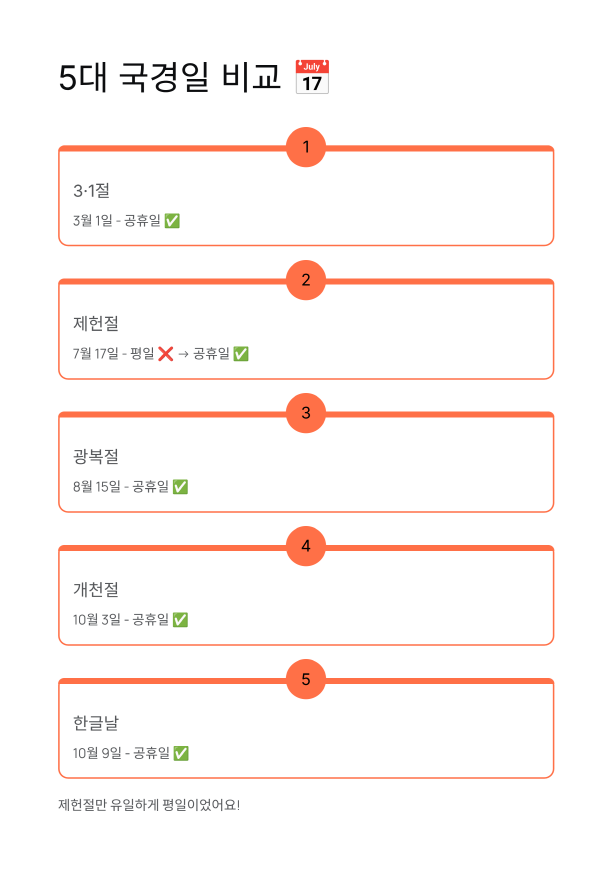 현재 대한민국 5대 국경일은 3·1절(3월 1일), 제헌절(7월 17일), 광복절(8월 15일), 개천절(10월 3일), 한글날(10월 9일)이에요. 이 중에서 제헌절만 유일하게 공휴일이 아니었답니다. 헌법을 기념하는 중요한 날인데도 쉬지 못했던 거죠!