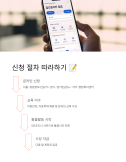 선정되면 다음 달부터 돌봄활동을 시작하고, QR코드나 사진 업로드로 돌봄시간을 인증하면 돼요. 그러면 그 다음 달에 수당이 입금된답니다!