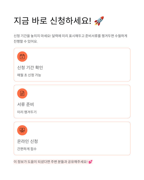 가장 중요한 건 신청 기간을 놓치지 않는 거예요. 매월 초에 신청 가능하니까 달력에 미리 표시해두시는 게 좋겠죠? 준비서류를 미리 챙겨두면 더욱 수월하게 진행할 수 있답니다.