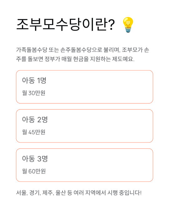 조부모수당은 정식명칭으로 '가족돌봄수당' 또는 '손주돌봐수당'이라고 불러요. 쉽게 말해서 조부모님들이 손주를 돌봐주시면 그 노고에 대해 정부가 매월 현금으로 지원해주는 제도랍니다.