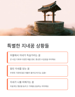우물가에서 큰 구렁이와 지네들이 득실거리는 것을 보는 꿈은 정신적, 물질적 사업과 관련이 있대요.