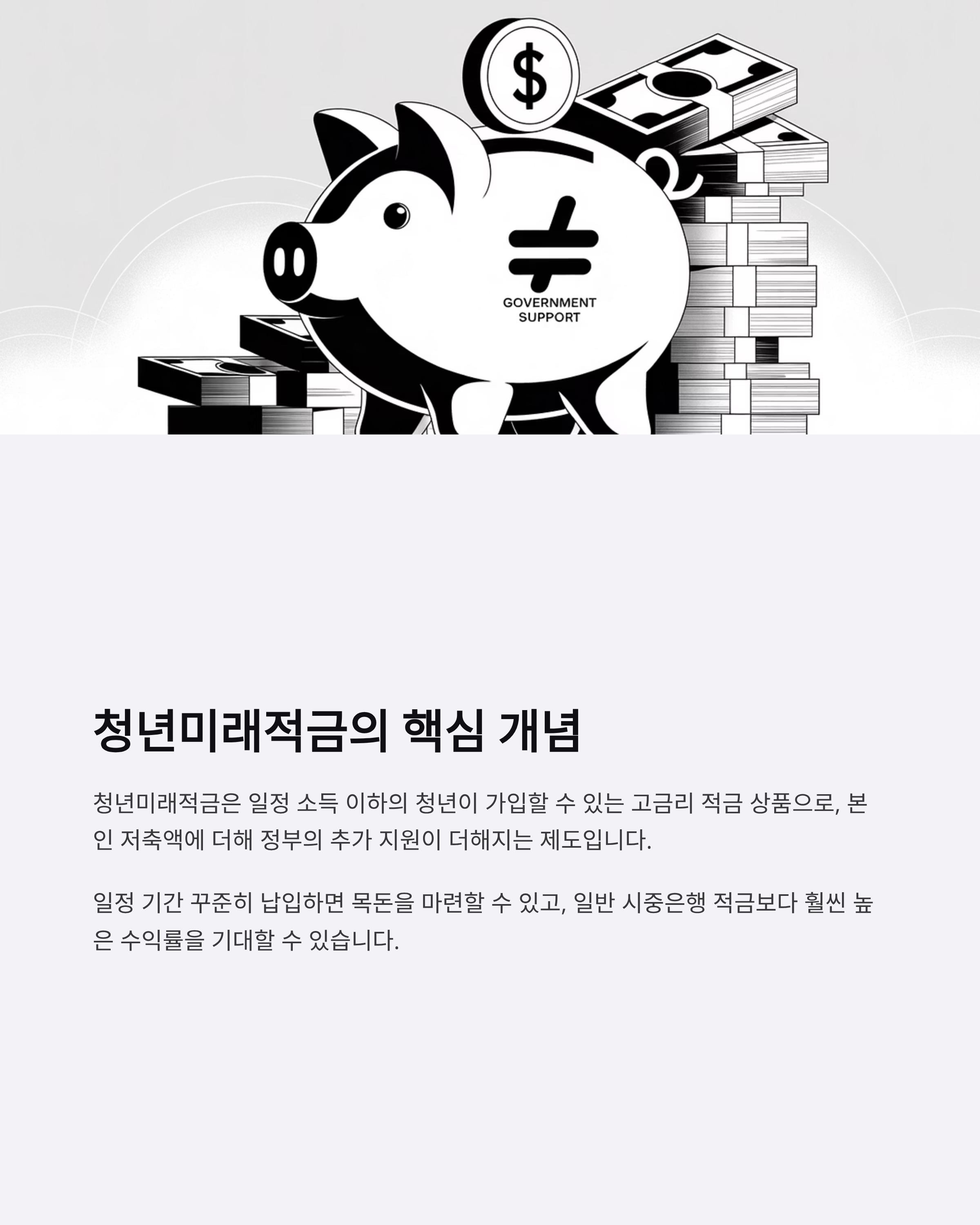 청년미래적금은 일정 소득 이하의 청년이 가입할 수 있는 고금리 적금 상품으로, 본인 저축액에 더해 정부의 추가 지원이 더해지는 제도입니다. 일정 기간 꾸준히 납입하면 목돈을 마련할 수 있고, 일반 시중은행 적금보다 훨씬 높은 수익률을 기대할 수 있습니다.