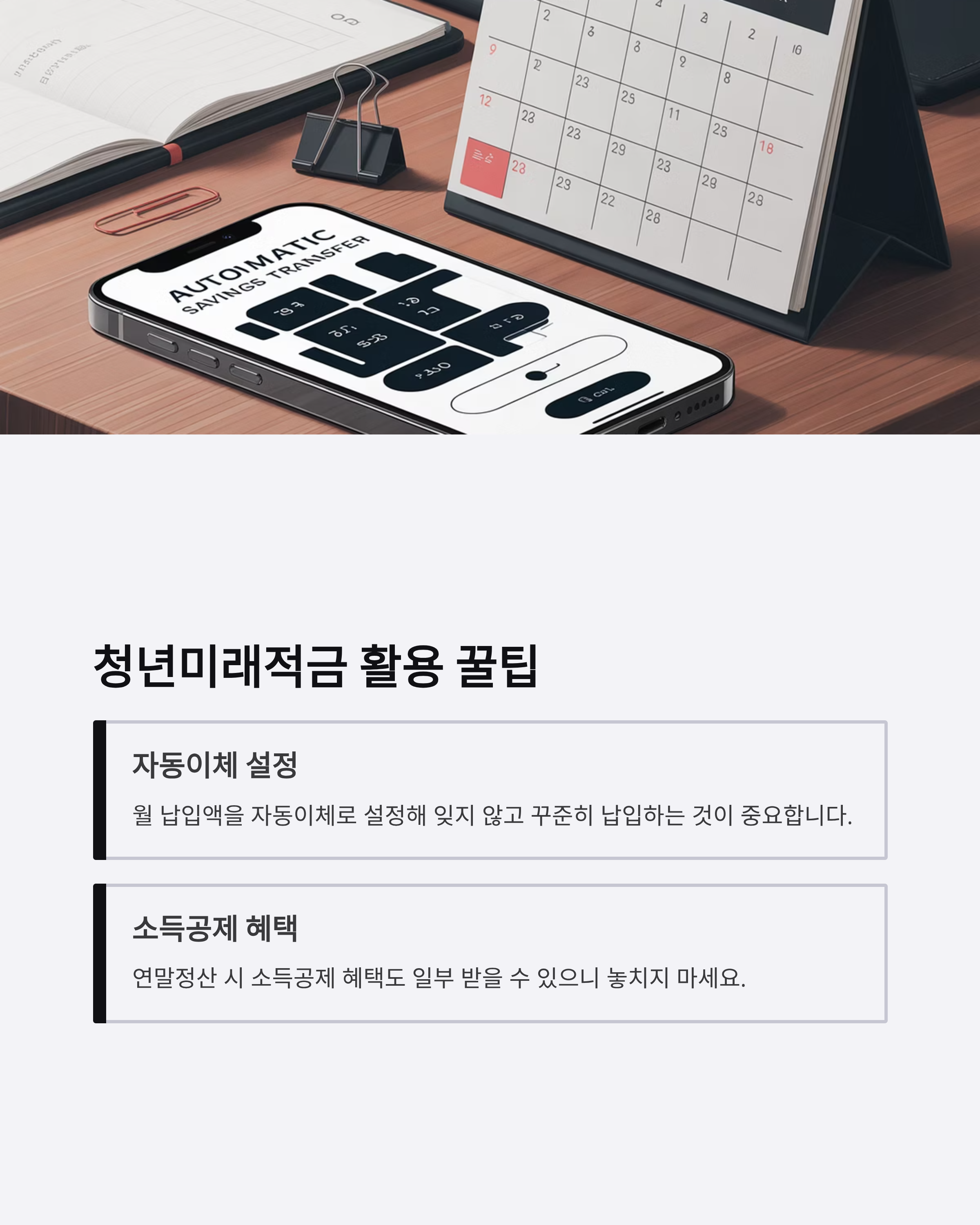 월 납입액을 자동이체로 설정해 잊지 않고 꾸준히 납입하는 것이 중요합니다. 또한, 연말정산 시 소득공제 혜택도 일부 받을 수 있으니 놓치지 마세요.